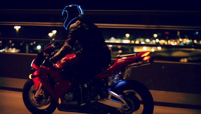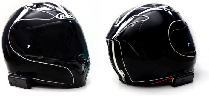 A company named LightMode has created a permanent helmet modification that surrounds your helmet with electroluminescent (EL) materials. The modification helps riders become more visible at night. This helmet modifications comes with a controller loaded with three modes: constant glow, blink and off. The controller can be mounted at the right side of the helmet via the space between the shell and the padding or via a curved adhesive mount. The EL components are fixed to the helmet using a super strong glue and a chemical accelerator. This ensures that the components do not come off with time.