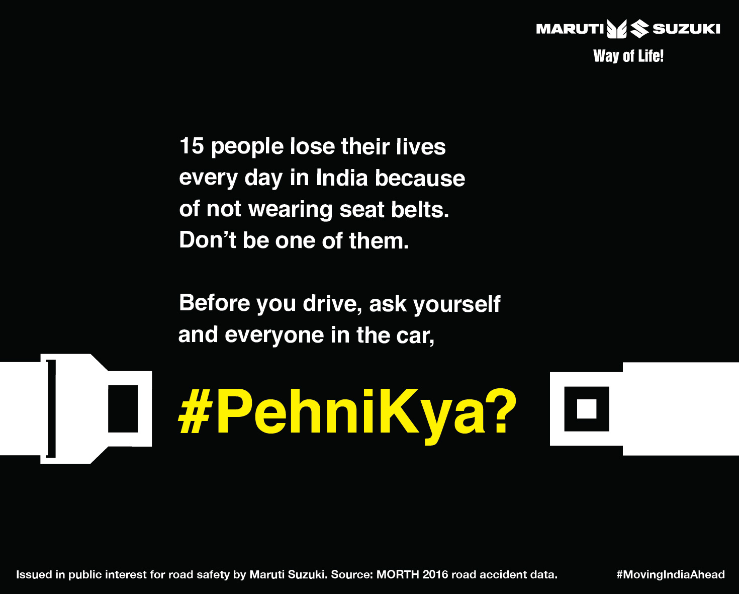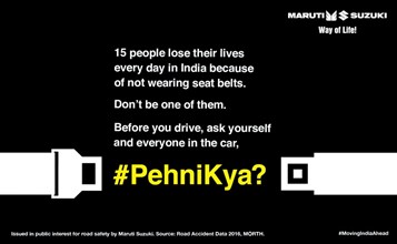 #PehniKya? a 360 degree campaign aims to educate passenger vehicle users about the importance of seat belts and its crucial role in preventing road fatalities and injuries. Through the campaign, Maruti Suzuki will sensitize people and break myths around seat belt usage. The messages will address concerns and reasons around seat belt usage, encouraging a positive behavioral change amongst car occupants.