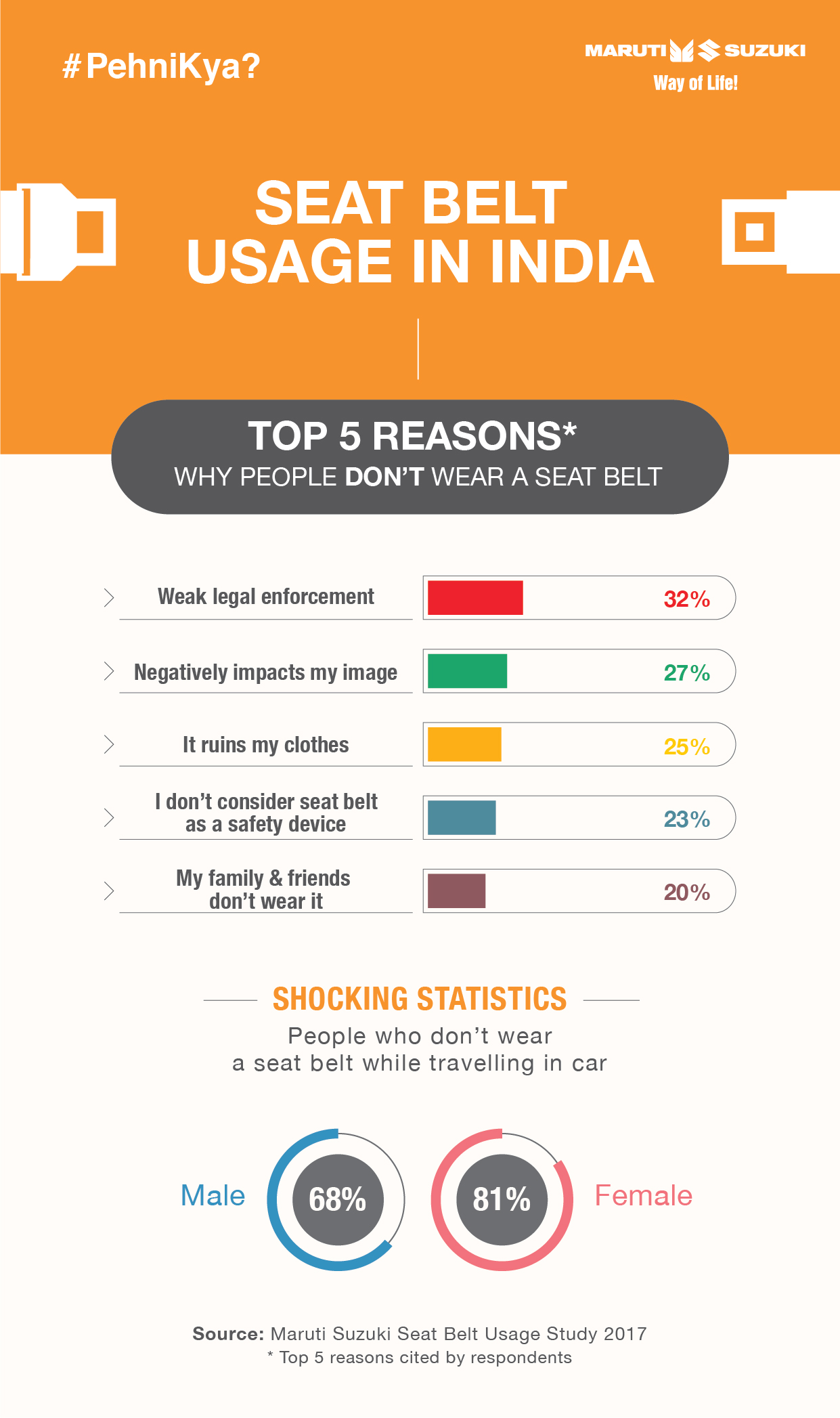 Besides weak enforcement, the key reasons for not wearing a seat belt include lack of awareness of its benefits, the fear that wearing a seat belt will “negatively affect image”, that friends and family “do not wear it” and that it “ruins clothes”.