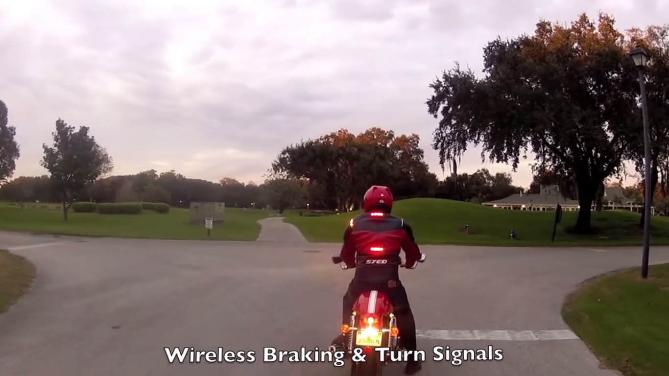 The wireless system in the jacket communicates with the motorcycle braking system and turn signals and operate accordingly to signal turns or brakes. The turn indicators and braking lights on the jacket are all LED which offer clear display even in broad daylight. As you can see in the video, the jacket mounted LEDs are in sync with the motorcycle lights and respond quickly to the motorcycle lights.
