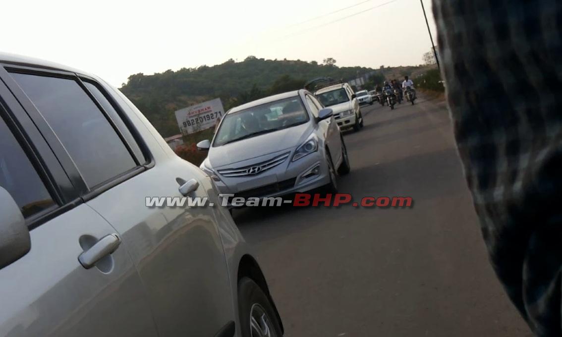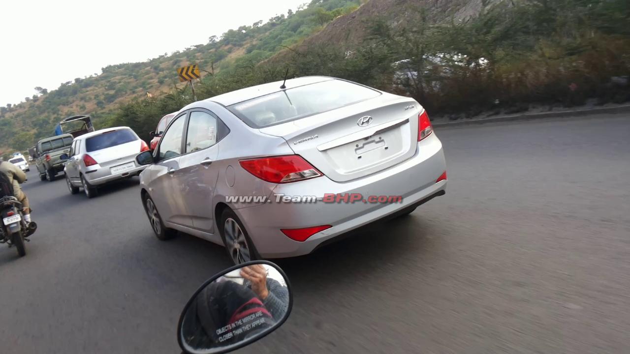 The facelift 2015 Hyundai Verna that is expected to hit the showrooms very soon has been spotted without any camouflage or disguise. And as we anticipated earlier, it looks exactly like its Russian counterpart, the Solaris. So now we can be sure that the 2015 Verna will receive projector headlamp. However, we were having a difficult time spotting the LED daytime running lights and assume that they are likely to be seen on the top of the line variant only. The front end also receives a two slat grille along with a redesigned bumper. The rear gets a newly designed bumper and tail lamps. The rear bumpers also receives integrated reflector.