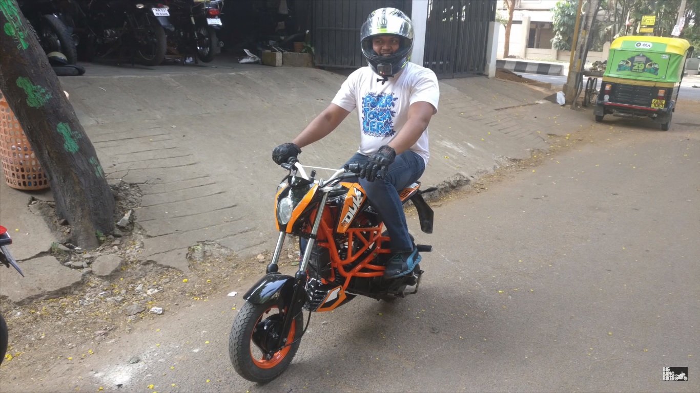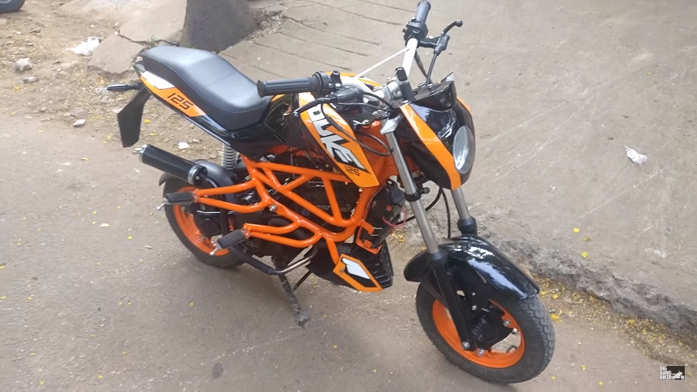 This TVS Scooty Pep+ and KTM Duke 125 hybrid comes from Bangalore. The modified scooter gets a complete visual overhaul. It dons previous generation KTM Duke’s headlamp, handlebar, body panels, and underbelly cowl. It even gets a tubular trellis frame and an aftermarket exhaust canister which gives it an aggressive note. That fuel tank, unlike the original KTM’s 11-litre capacity, is limited to just 2-litres and we’re sure it’d be a frequent visitor to fuel pumps.