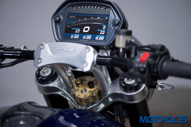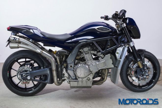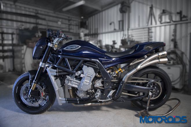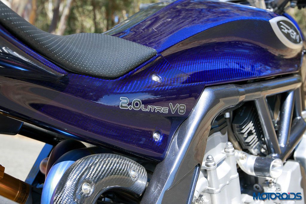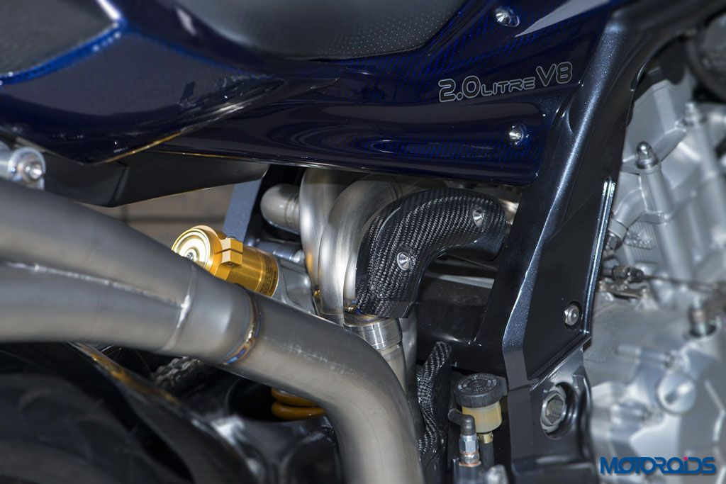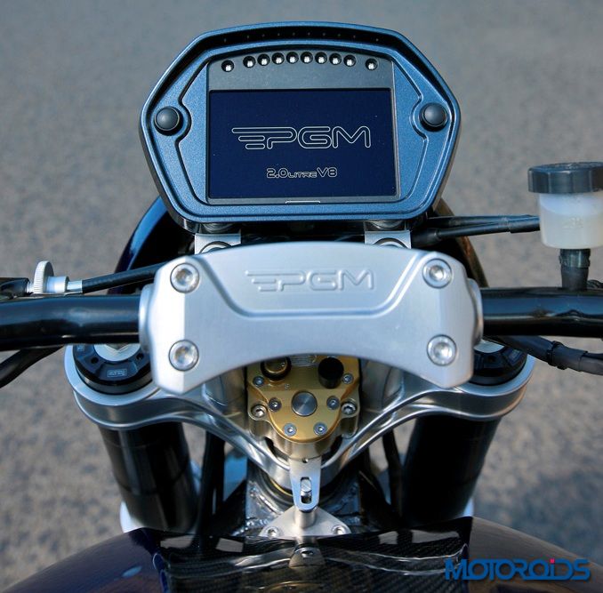 Coming to the engine specifications for which you clicked on the hyperlink, propelling the PGM V8, as its name suggests, is a 1996 cc V8, liquid cooled, DOHC engine that produces a peak power output of 334 hp at 12,800 rpm while the peak torque stands at 214 Nm at 9500 rpm (Both at the countershaft sprocket). The tech-spec sheet misses the top speed figure but the motorcycle comes with a tagline “How brave are you?”, indicating the capabilities of this V8 powered machine. Electronics are handled by Motec M130 ECU while this massive engine passes the power to the rear wheel with the help of a six speed gearbox. Suspension duties are taken care of by Ohlins fully adjustable USD forks upfront and the Ohlins TTX Mk2 shock with a custom link at the rear.