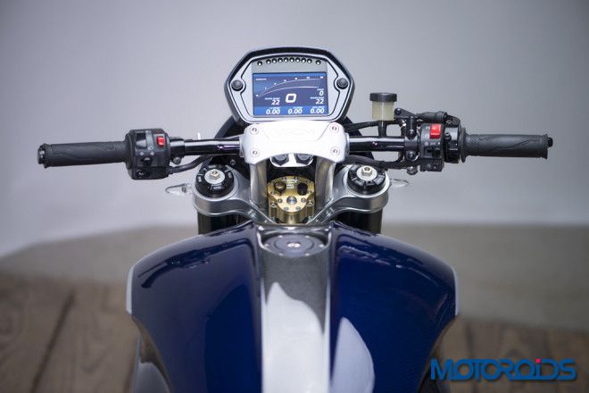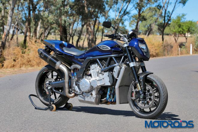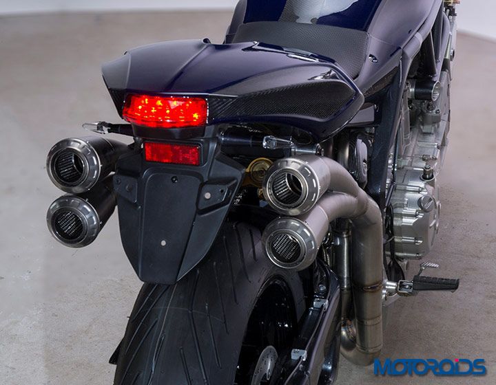 Stopping this 242 kg (wet weight) ballistic missile of motorcycles moving in three digit speeds requires some really potent brakes and that task is performed of by 320mm discs with Brembo GP4 Nickel plated calipers on the front and 220 mm discs with Brembo P4-34 Nickel plated caliper at the rear. The wheelbase measures 1540 mm and the seat height stands at 840 mm. The 16.5 litre fuel tank seems satisfactory, if not less, with the fuel guzzling V8 chugging heavy doses of gasoline at the twist of the throttle. The twin titanium 4-2–1 setup exhausts by Akrapovic enhances the thunderous sound to the V8 motor and is definitely a poetry, in motion or while idling standing still, for petrol heads (Check out the video below to hear the exhaust sound). A four muffler exhaust, again from Akrapovic, is also available for the motorcycle.
