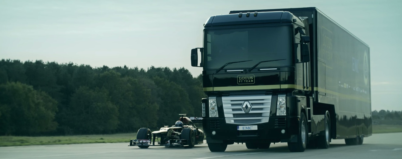 The Renault truck was driven by American stuntman Mike Ryan, and behind the wheel of the Lotus F1 car was fellow stunt driver Martin Ivanov. A special ramp was created and the the truck flew a total of 83 feet and 7 inches from its launch point, with the speeding F1 car slipping beneath it.