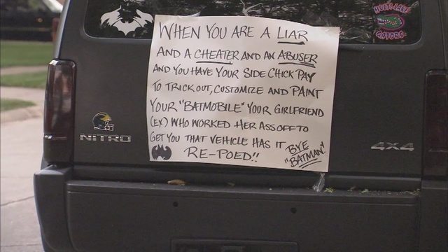 The car is yet to find a owner but Estrada has parked the SUV near her house with a huge note on it saying: “When you are a liar and a cheater and an abuser and you have your side chick pay to trick out, customize and paint your “Batmobile” your girlfriend (ex) who worker her ass off to get you that vehicle has it re-poed!! Bye “Batman”!!