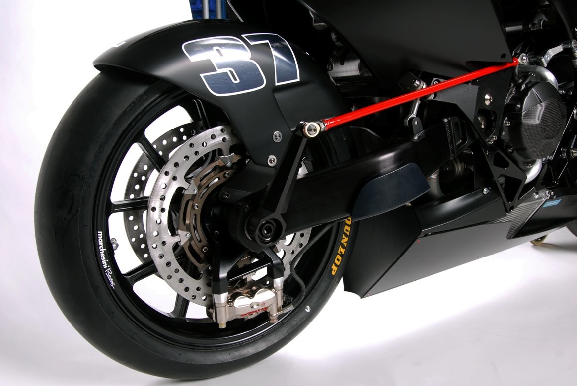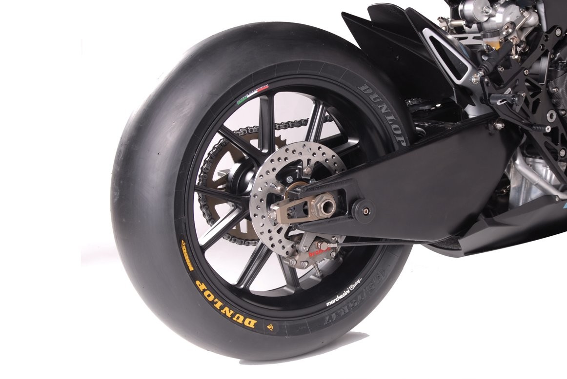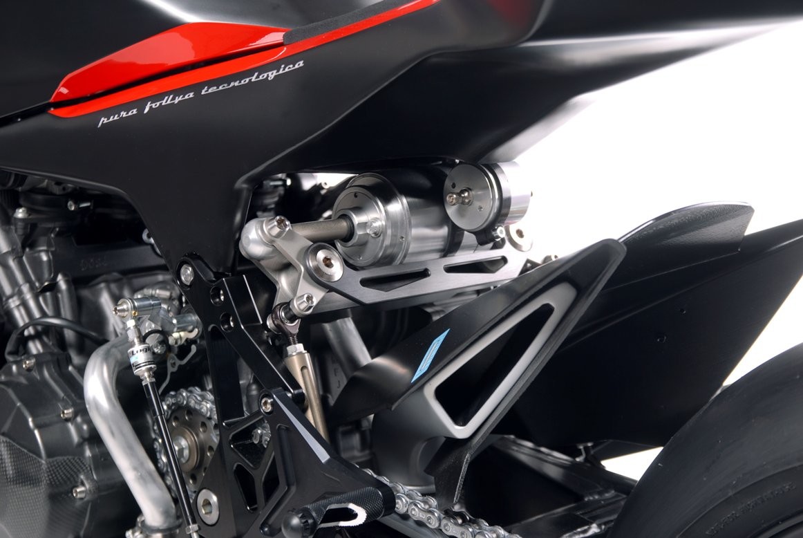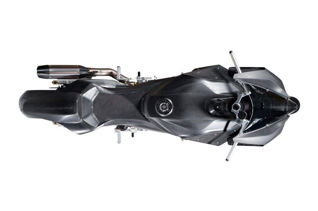 While the companies parted ways, Vyrus, since its return, has developed three products. This one here is one of those three motorcycles, the 986 M2, and it does remind of the Tesi. The biggest resemblance is the hub-center steering front suspension arrangement. The hubsteer features “antidive” which means it does not dive under braking, resulting in weight distribution on both wheels for better stability.