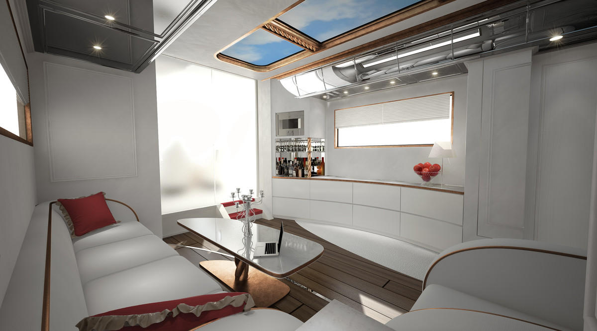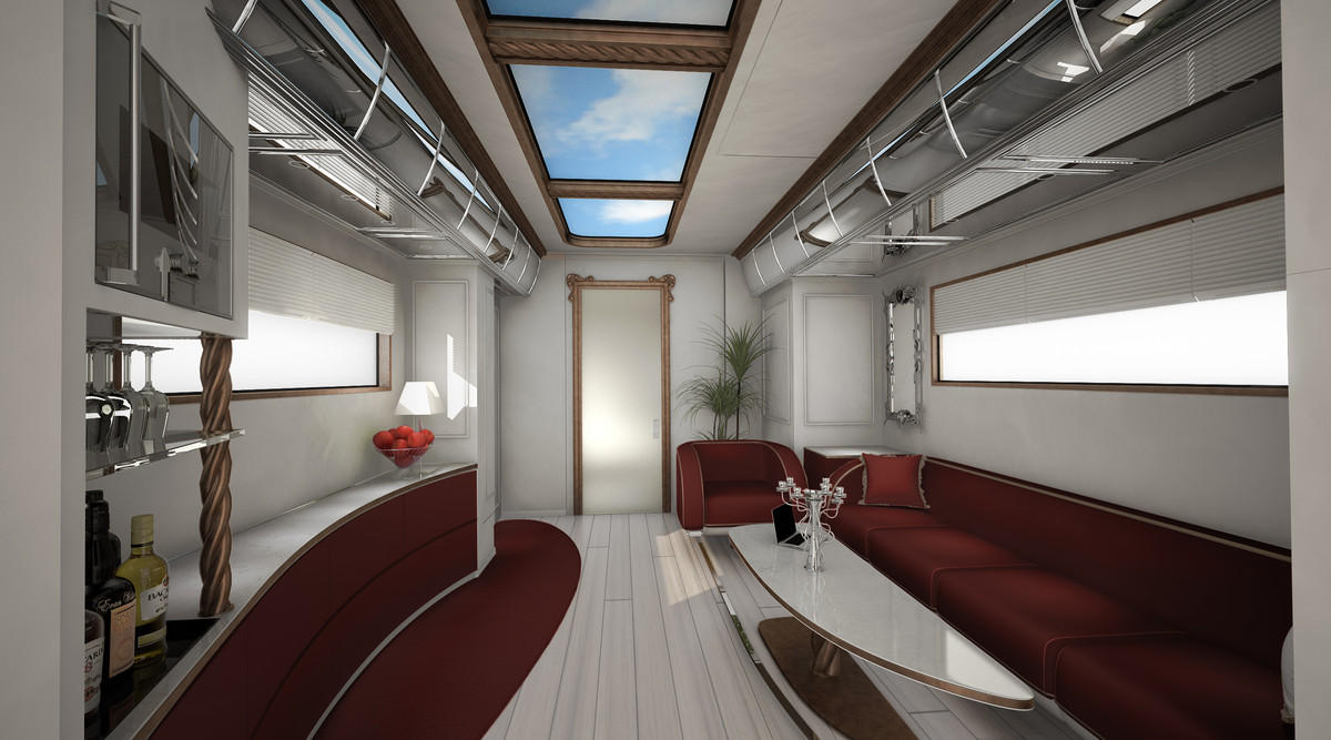 The RV measures 40 foot in length and has been built by Austrian company Marchi Mobile. On the inside, this extravagant recreational vehicle comes with a pop-up rooftop terrace and cocktail lounge, plus a fireplace, master bedroom, and underfloor heating. The master bedroom (with its own bathroom) and cockpit are actually on the second of two levels.