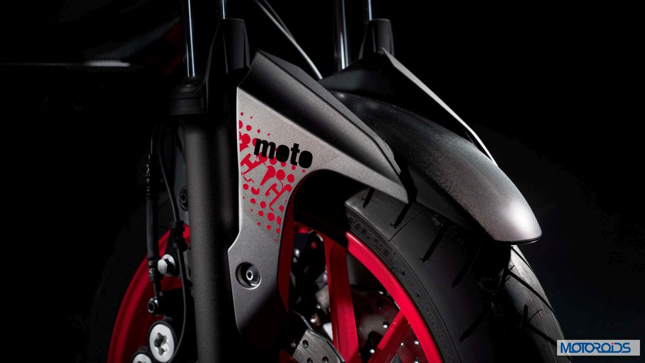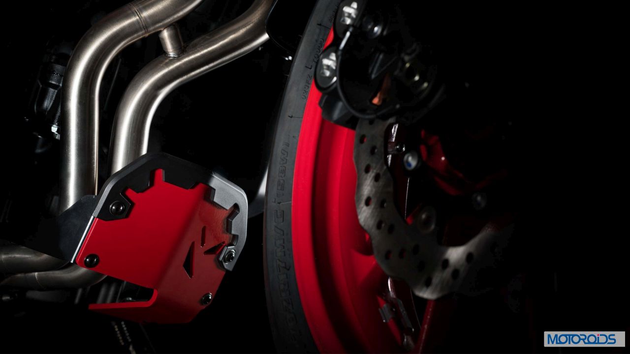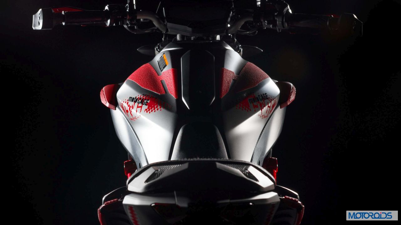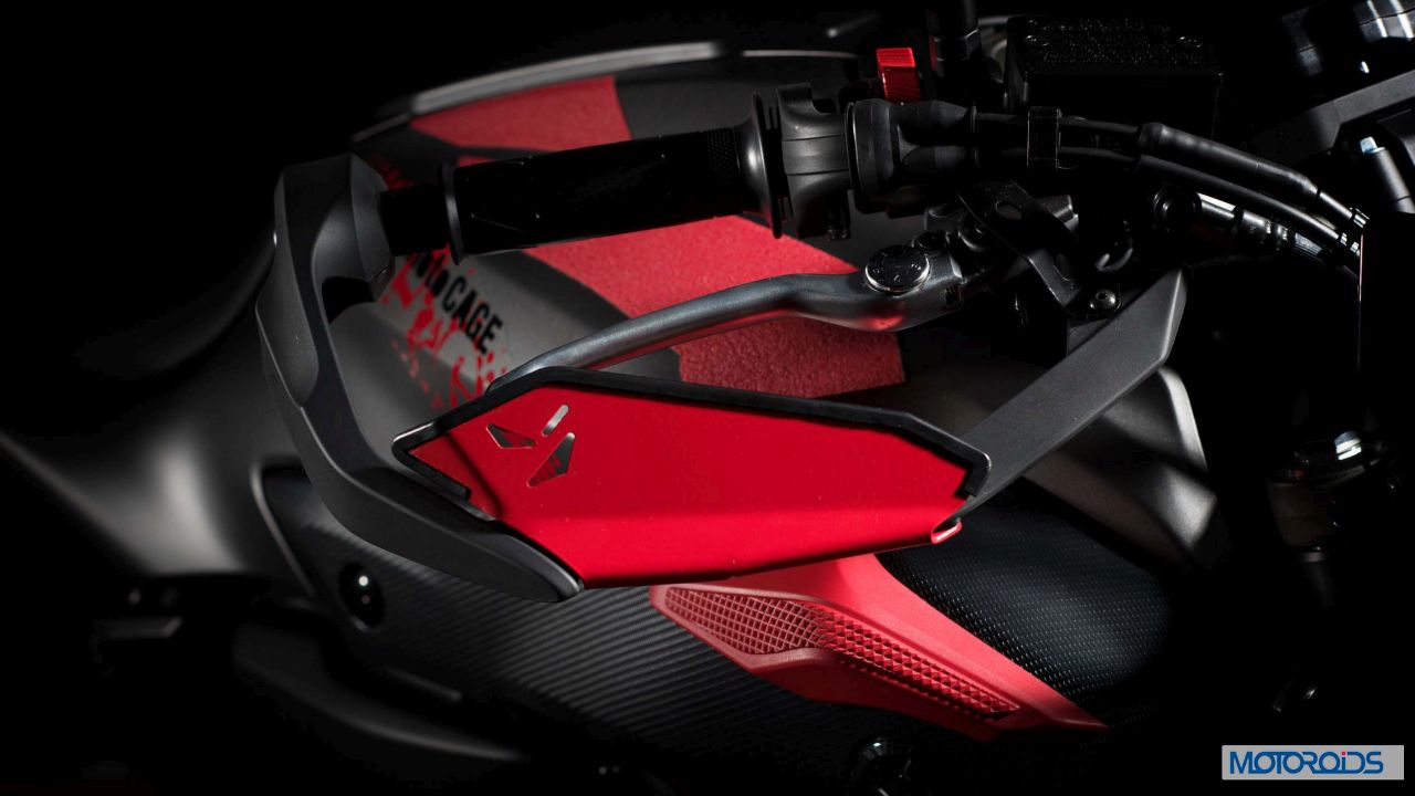The stock model has been tweaked for the daredevils by means of an extra cage above the crankcase for additional engine protection. Extra protection also comes in the form of a small skid plate, red painted knuckle guards and stamped radiator guards. The front and rear wheels are painted in different colors – red and black (with red pinstripes) respectively. Also differentiating the special from its base version is a small crown above the head lamp. The pillion seat has been redesigned and the motorcycle gets a generous splattering of special Moto Cage graphics across the body.