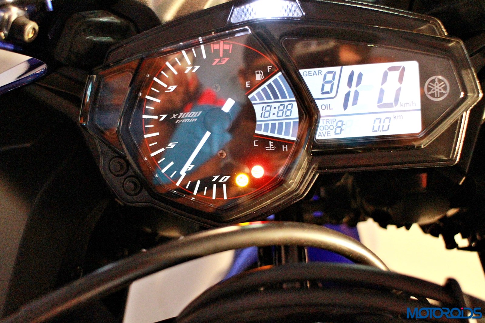 It looks beautiful, this machine. From afar, it resembles a full-blooded superbike and it is only the small bits and bobs like tyres and conventional telescopic forks upfront that give its small heart away. Personally, I would have preferred that they retained more of the R25 concept that they displayed at the Auto Expo two years back, but this will also do nicely. Anyways, bombastic design cues on show models rarely make it into production. We had two colour options on display; the trademark Yamha white and blue, and an all-black affair with red highlights.