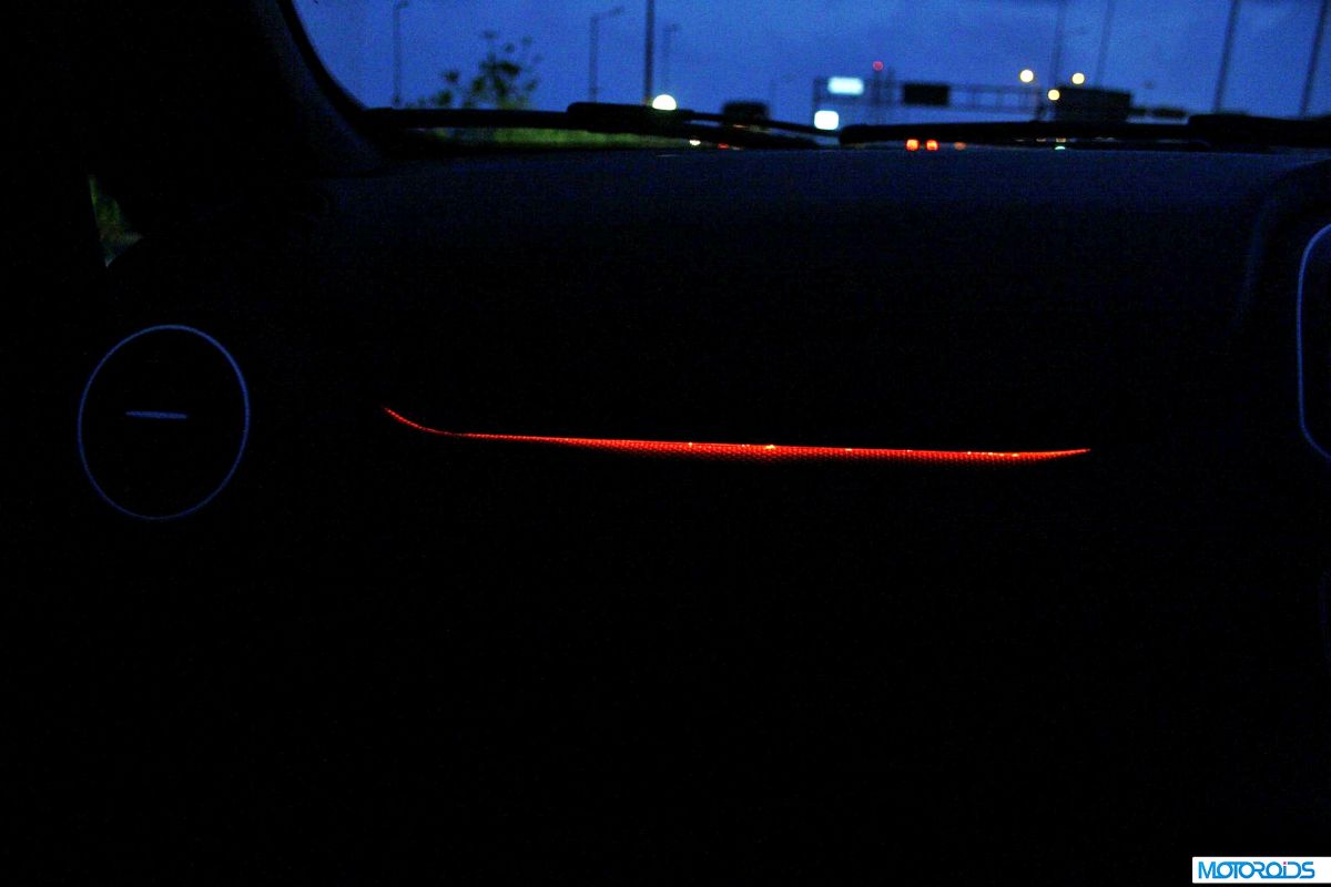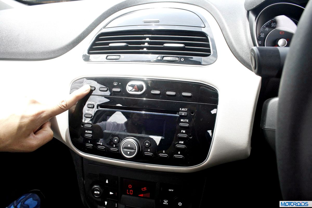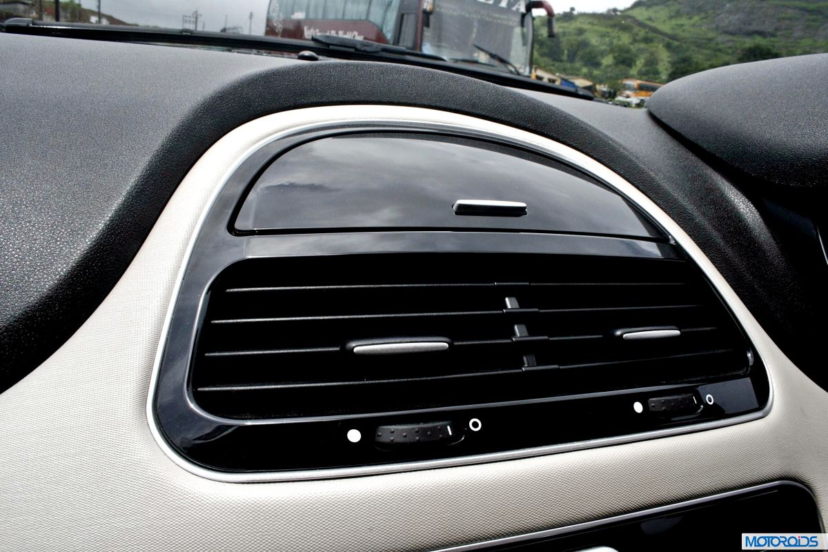 The central console has piano black finish with brushed silver surrounds. A small storage space is available at the top of the central AC vents as well, but has affinity to AC condensate. It can easily accommodate couple of small cell phones or a wallet. The AC vents on either side are circular while the central ones are rectangular. The media centre console with the CD changer is completely new with small buttons. The AC controls are similar as the GrandePunto/Punto. The interior amber lighting streak on top of the glove box is a classy touch as well.