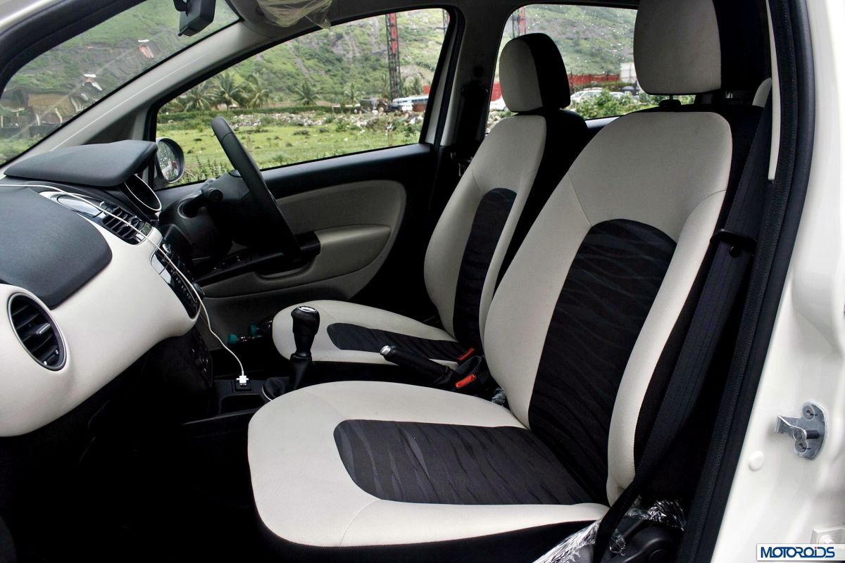 Like the exterior, the interiors of the Punto Evo are a substantial upgrade. While the earlier design was simply classy and elegant, the new dash design is contemporary, very European. The dashboard has a double layer curvy console with tri-tone effect. The two options available are beige and black/gray and the racy all black. The new dashboard you see in the pictures has a soft feel satin finish fabric in beige while the rest is a mix of piano black, chrome and black grain surfaces. Our preconceived notion about the durability and resistance to soiling was safely put to rest when we saw the fabric repelling rain droplets. Gone are the days when air-conditioning was a luxury on the “Dx” models made available by manufacturers, these days cars being driven with the windows rolled down are a rare sight. The beige fabric should put up a good resistance to weathering then, with the help of some TLC from the owner as well.
