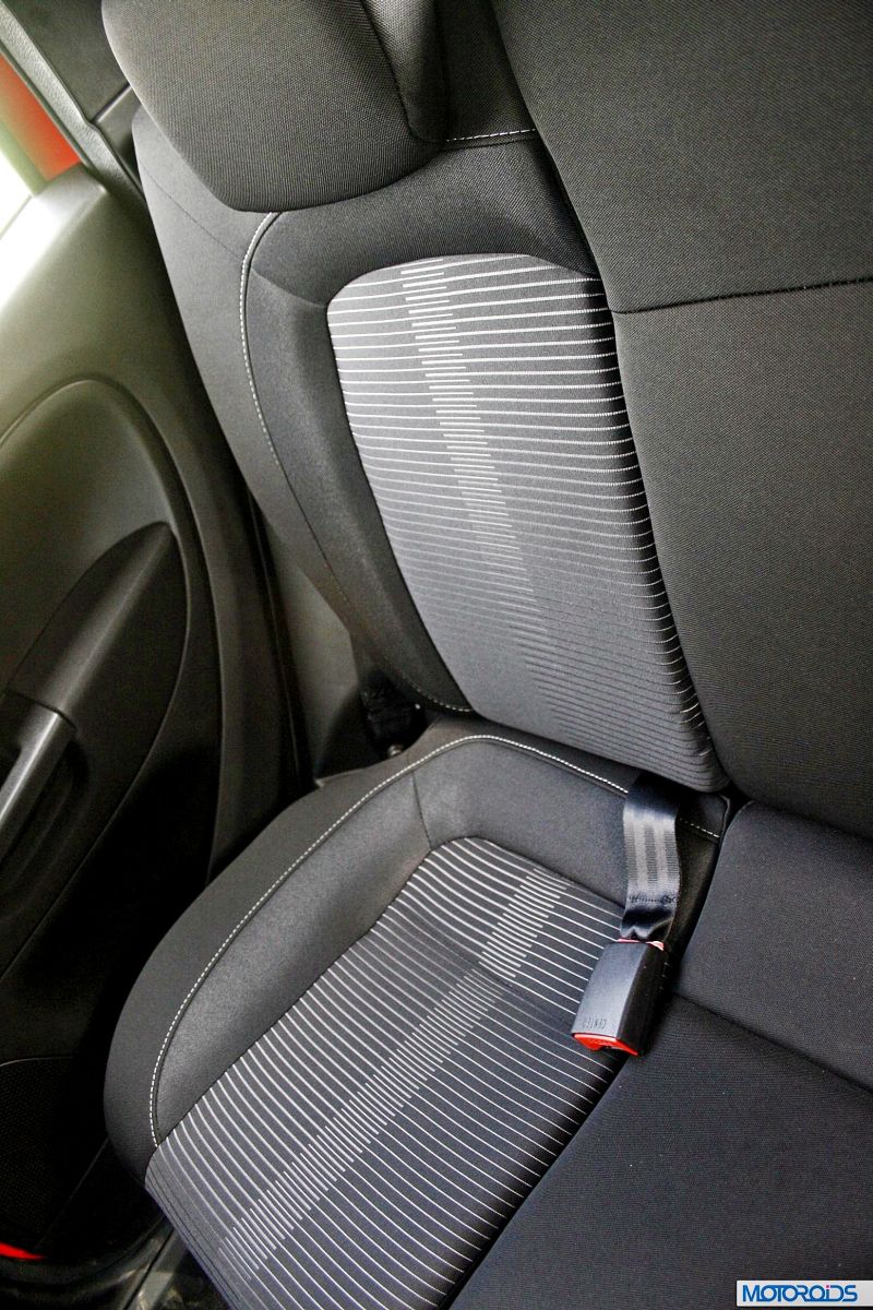 The all black interiors are found on the 90HP version we drove, and despite the so called `dreary` feel, we liked it for the sporty feel it exuded. The beige trim is replaced with what feels like textured rubber/vinyl finish. The roof lining on the all black interiors is also, black. The seats of the all black interiors have gray striped center panel with good body hugging contours.
