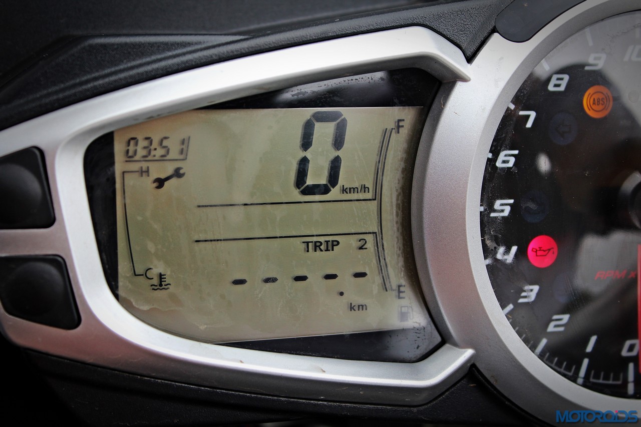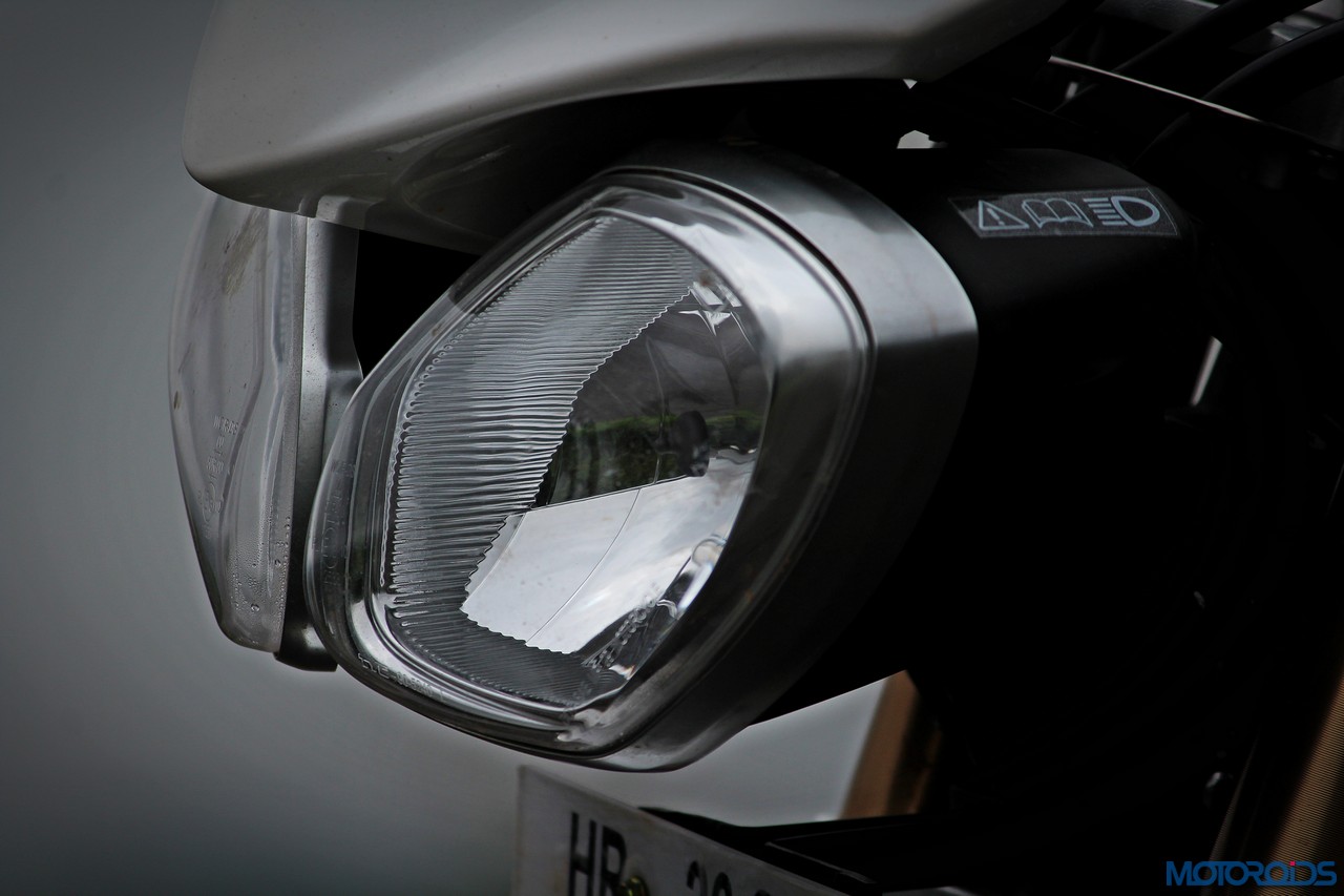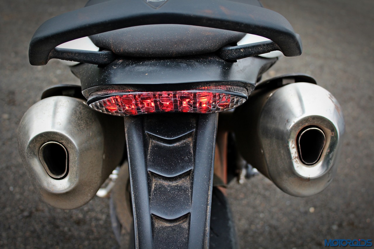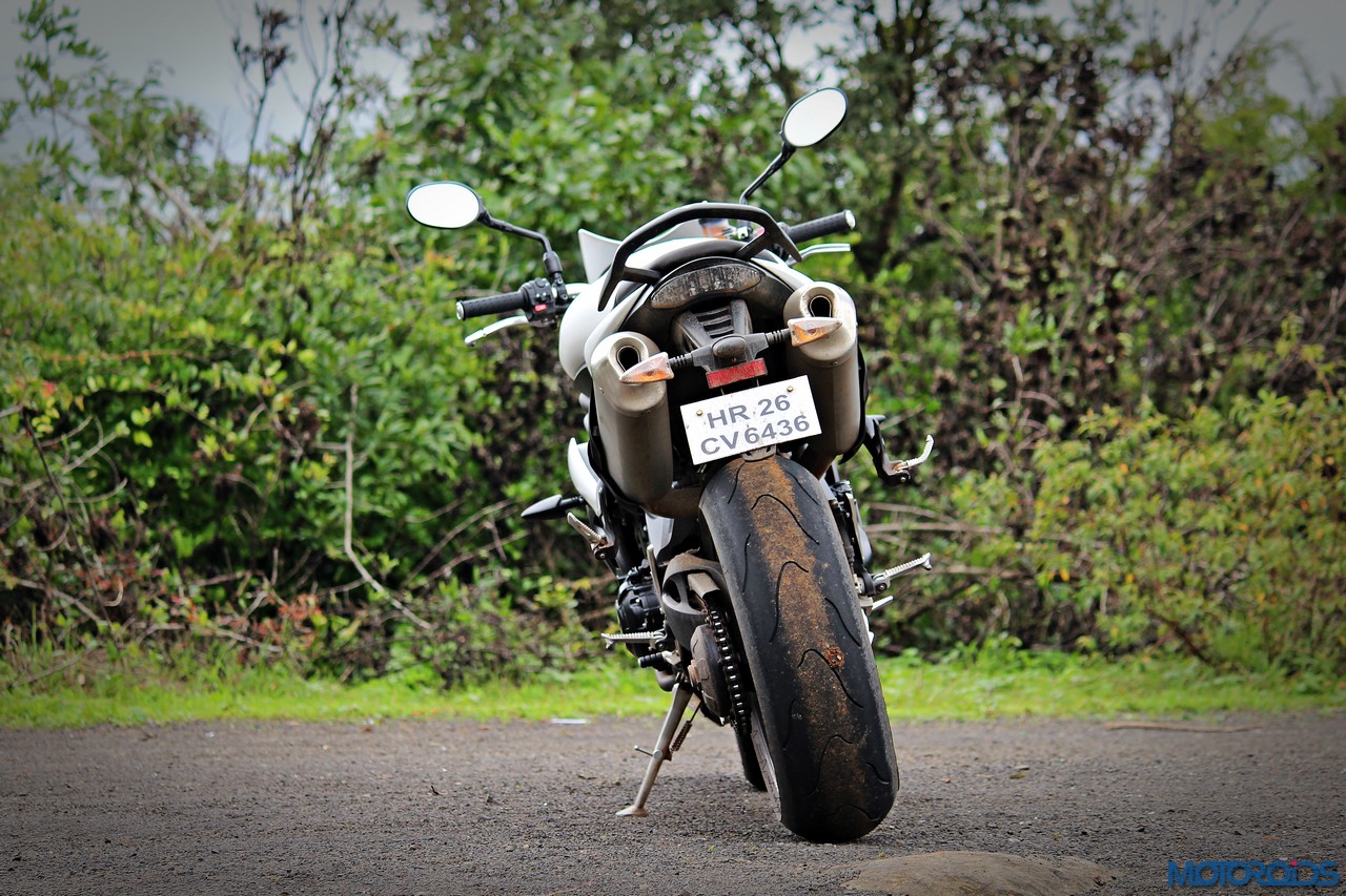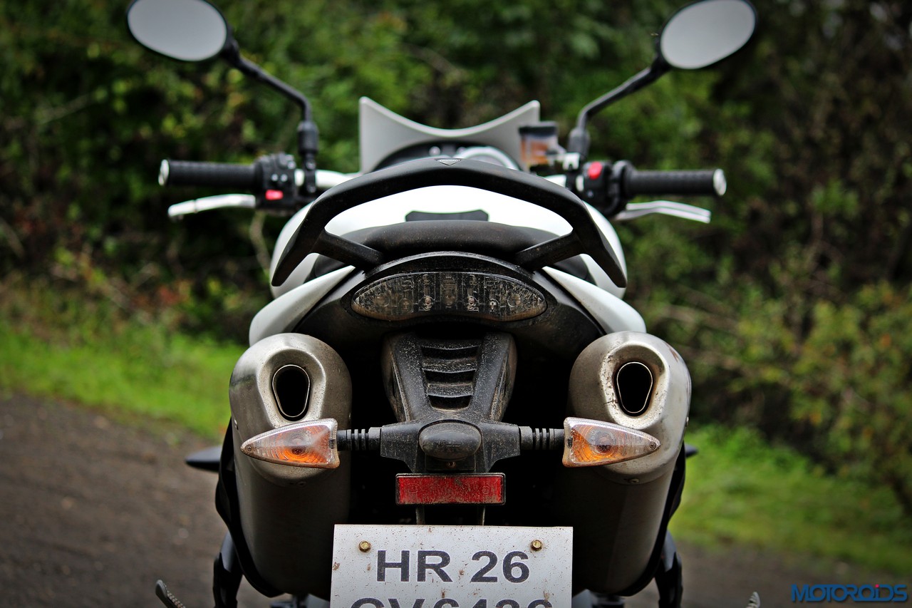 As for the appearance, it isn’t a diva. But once you get used to the bug-eyed front end, the white capped excuse for a wind deflector and the itsy bitsy pieces of bodywork, it looks just fine. It’s got a purposeful stance, and I quite like the twin, upswept exhausts.
