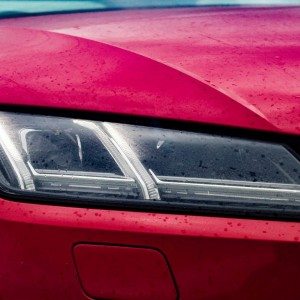 The bonnet lip is angled sharply, with deliberately pronounced, gapped shut-lines to underline what has always been a TT signature. The small surface between the grille and the edgy headlamps almost forms a mini air-scoop under the bonnet’s shut line. The razor sharp headlights are relentlessly angular, feature sharply styled DRLs, and share styling cues with the upcoming second generation R8.