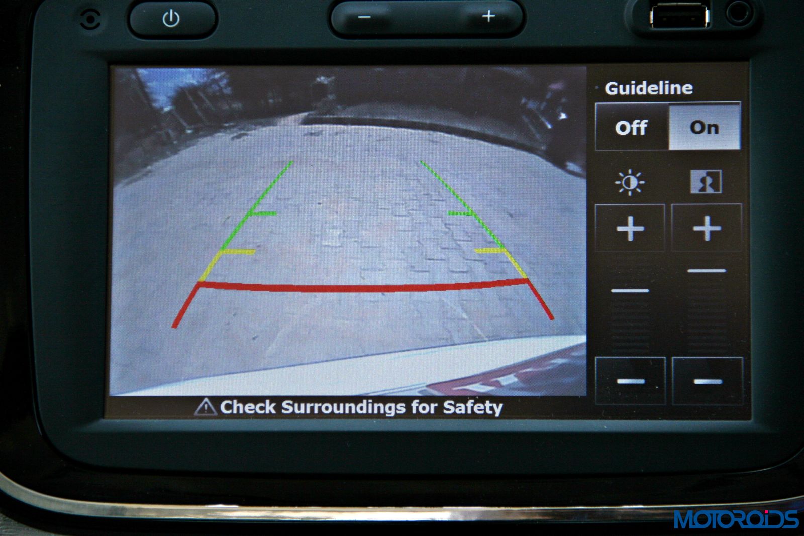 Rear parking sensors with rear parking camera (above), which outputs its footage on the 7” screen on the center console (below).