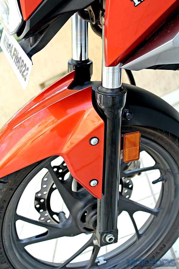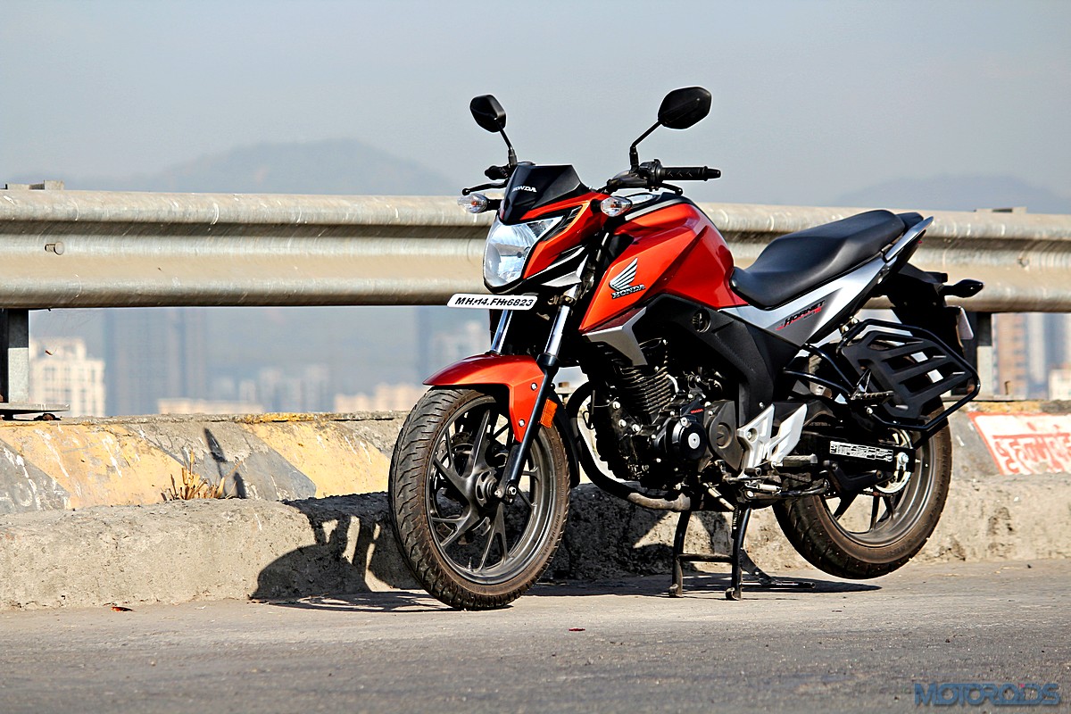 The Hornet handles predictably, with the well balanced chassis and mono-shock letting the motorcycle flow through the corners like hot knife through butter. It manages its weight and fluids gracefully around bends, strengthening its friendliness with the rider as the game progresses. The CB Hornet 160R comes with 17 inch, five-spoke alloy wheels, shod with 100/80 section tubeless tyres at front, and 140/70 section tubeless tyres, at the rear. Grip is adequate, but not so much when the tires are cold. Straight line stability is brilliant, and even in the upper reaches of its performance, the Hornet stays glued to the road, showing no signs of twitching or nervousness.