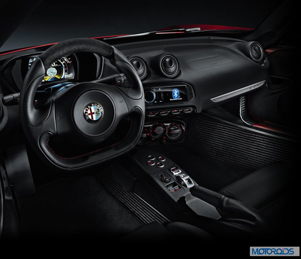 The cockpit is small as in a Smart and the quality is at the same standards. Hard plastics are used for weight saving and some familiar components (wheel switches and air ducts) from previous Alfa are used for cost saving and suit perfectly the essential look of the cabin. There is no moquette inside but the luxury of well finished carbon fibre and aluminium racing style pedals coming out of the floor.
