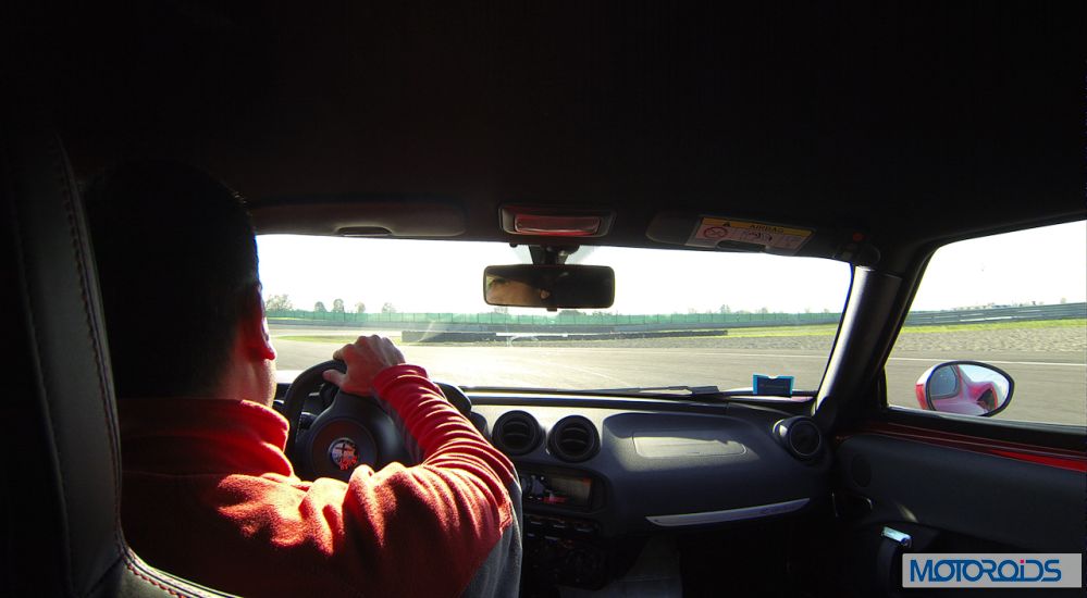 The steering wheel is not assisted. You heard it right, its manual – a choice made on purpose by Alfa engineers for better road feeling and weight saving. It is very heavy on parking maneuvers and your girlfriend might hate it. Maybe that’s a good thing, for she’ll never want to drive your precious machine. Steering gets lighter in town but still not comfortable. But who needs comfort in a car like this? The wheel is flat bottomed and ergonomically not perfect where hands wrap it – it could have been a tad thinner we reckon. Rear visibility is non-existent, there is a tiny window only above the cylinder head but then again, such things don’t matter much in a car that very few will try to pass!