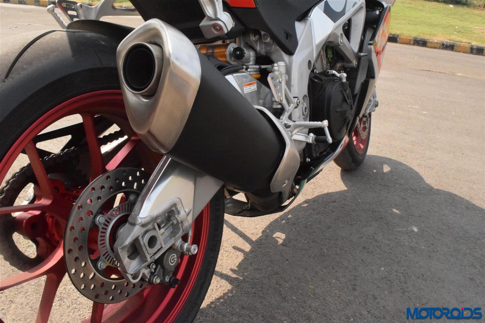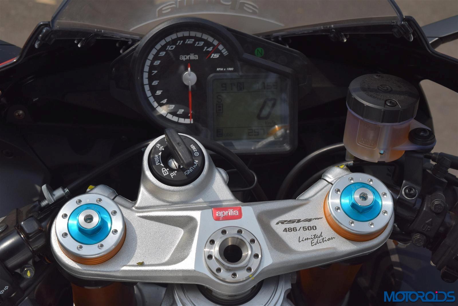 We swung our leg across # 486 out of the allocated 500 worldwide and the RF felt completely at home. The tall first gear does tend to make a task of the clutch needing frequent inputs to avert knocking when piloting around town, but settles down with a raucous rumble exhaust note levitating to a rasping V4 grunt once you get cracking on the throttle, shifting through the buttery smooth box. Missing the clutch isn’t a bother either, the Aprilia Quick Shift would get the power flowing without sacrificing engine spin. Except the momentum trying to bury your posterior right into the seat, you won’t feel any perturbing thing on the motorcycle. Even at the peak of its limits, the RF is poetically calm and composed. Get the needle to breach the 6000 rpm mark, and the Aprilia mutates into a warp portal. The acceleration is overwhelming and keeps getting stronger as the needle traverses its uphill journey. The pleasant distraction would force bystanders to twist their necks trying to figure what just flew past.