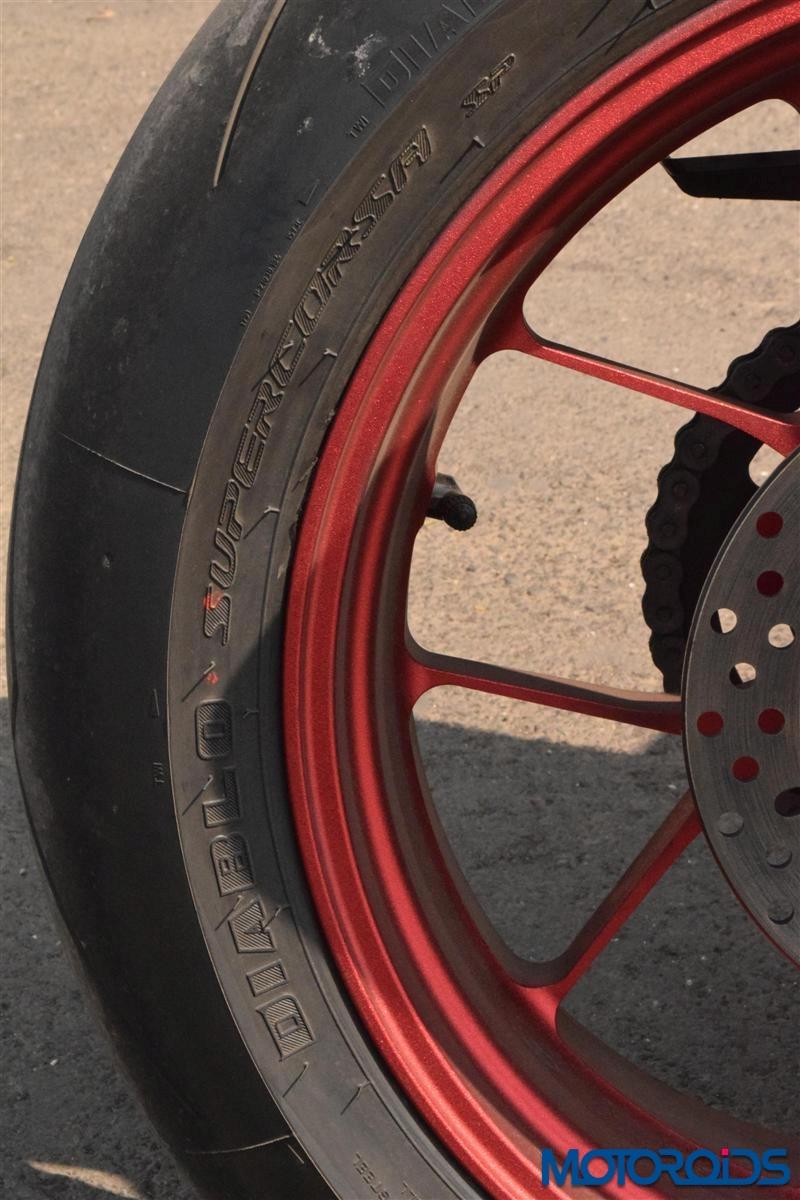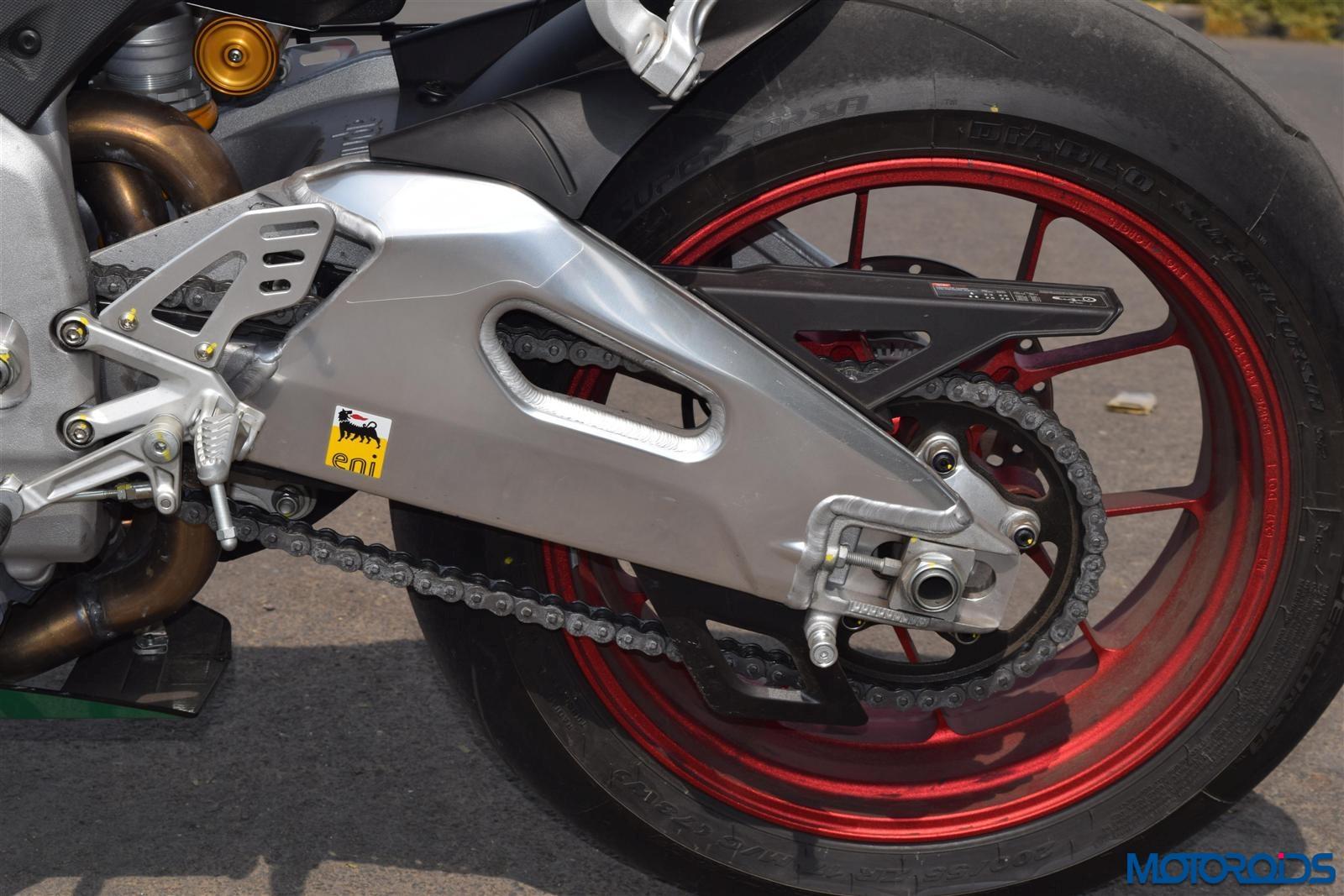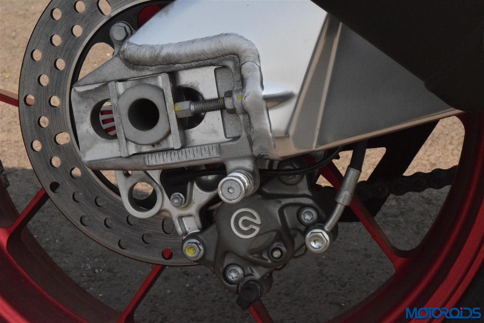The pressed cast double braced aluminium swingarm has been lengthened by 4 mm over the earlier model towards better traction and decreased tendency for wheelies during violent acceleration.