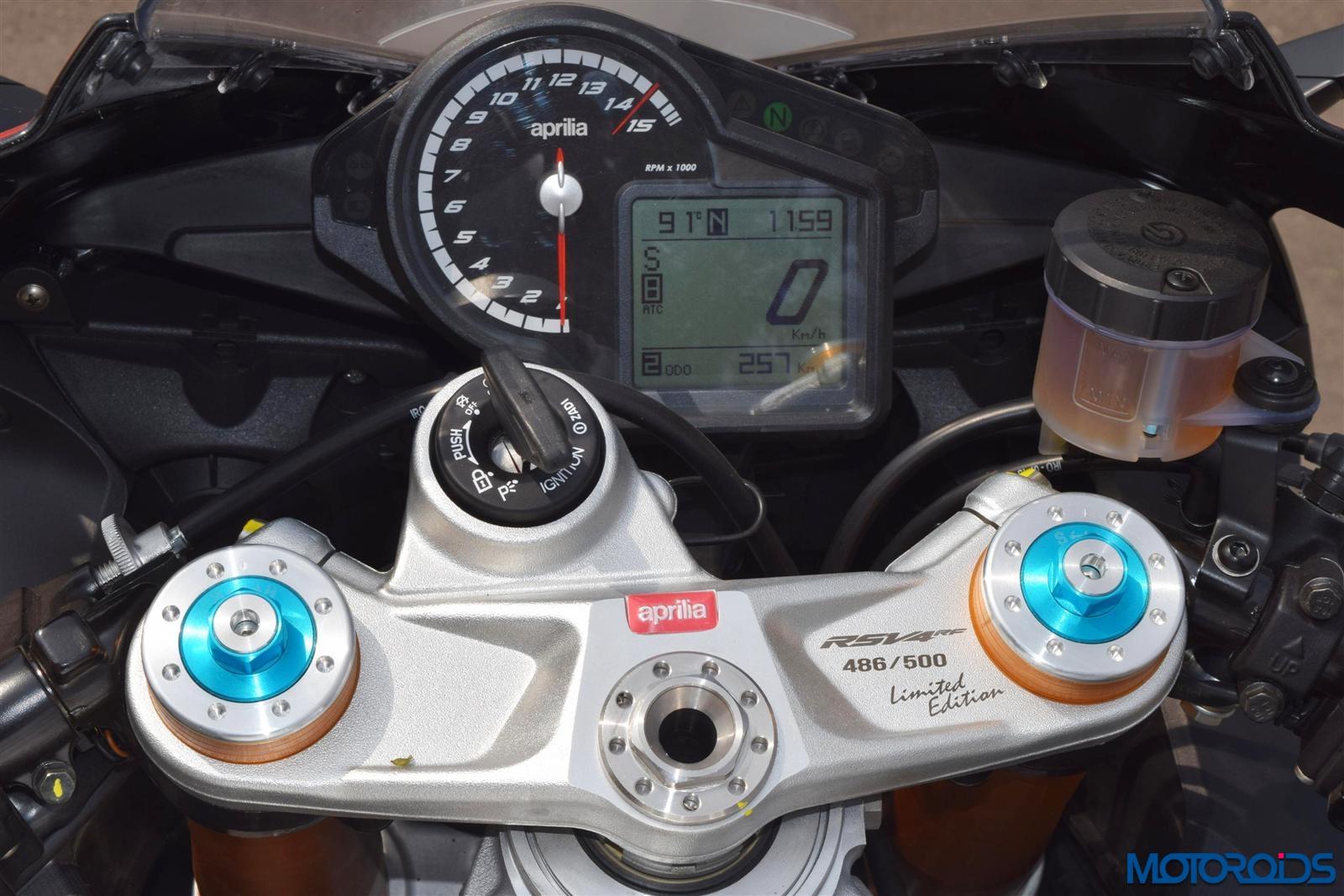 We swung our leg across # 486 out of the allocated 500 worldwide and the RF felt completely at home. The tall first gear does tend to make a task of the clutch needing frequent inputs to avert knocking when piloting around town, but settles down with a raucous rumble exhaust note levitating to a rasping V4 grunt once you get cracking on the throttle, shifting through the buttery smooth box. Missing the clutch isn’t a bother either, the Aprilia Quick Shift would get the power flowing without sacrificing engine spin. Except the momentum trying to bury your posterior right into the seat, you won’t feel any perturbing thing on the motorcycle. Even at the peak of its limits, the RF is poetically calm and composed. Get the needle to breach the 6000 rpm mark, and the Aprilia mutates into a warp portal. The acceleration is overwhelming and keeps getting stronger as the needle traverses its uphill journey. The pleasant distraction would force bystanders to twist their necks trying to figure what just flew past.