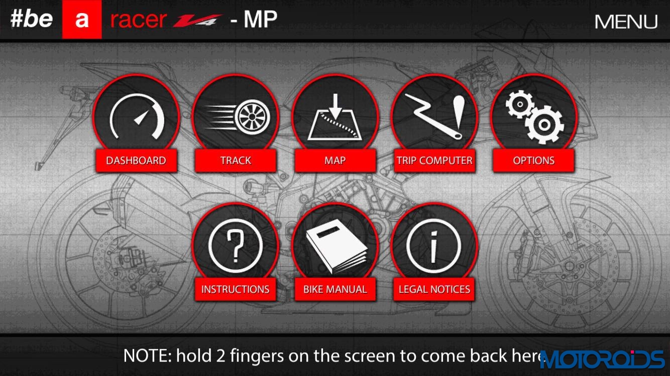 The V4-MP system aids in “corner-by-corner” electronic management using the phone’s GPS feature. It recognizes the position of the bike and automatically changes the electronic adjustments (traction control and anti-wheelie) based on the settings the rider has selected, corner by corner.