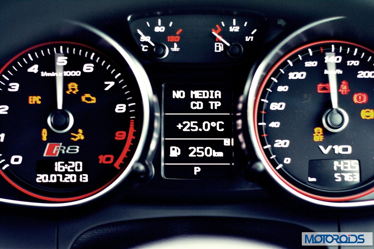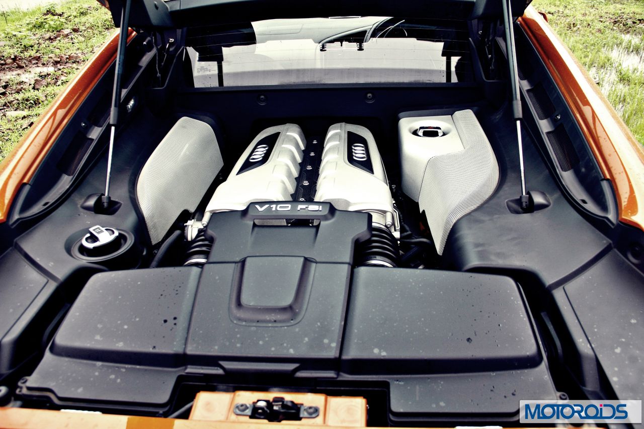 Twist the key and the engine fires up with a hoarse, testosterone laced sound. There is enough happening under that glass window behind the driver, with those ten cylinders laid out in a V configuration to create a thunderous, ominous sound. You can make out that some large and extremely well engineered machinery is at work as the R8 V10 idles. The torrent of power barraged within that chassis makes its restlessness to break loose evident with that gruff, throaty sound.