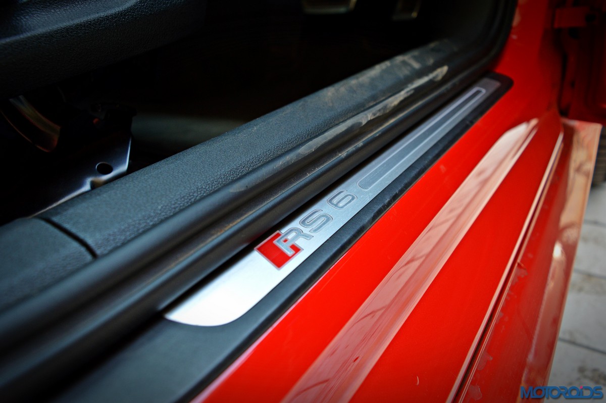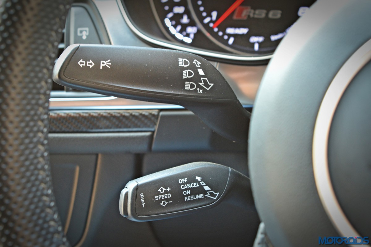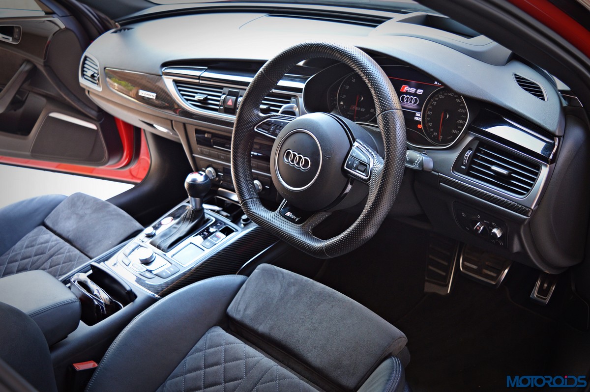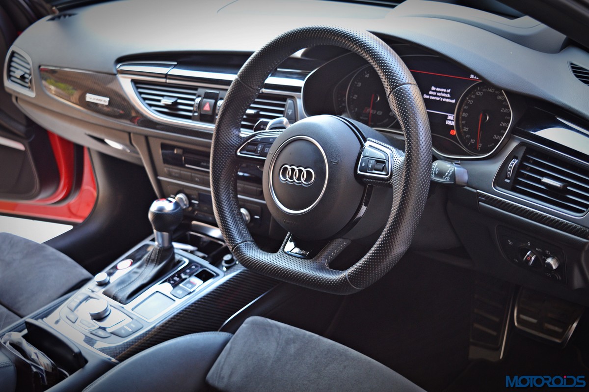 Inside, it’s all-black hued, but has the air of an expensive Italian tuxedo, one that is also in a hurry. The familiar A6-sourced dashboard is festooned with glossy, optional carbon fiber inlays, which are pasted on the door trims and lower console as well.  The flat-bottomed, perforated leather wrapped RS steering wheel is sporty enough to give you freckles on your face the second you touch it, while the RS-specific dials are as clear and legible like the full moon’s biggest craters on a cloudless night.