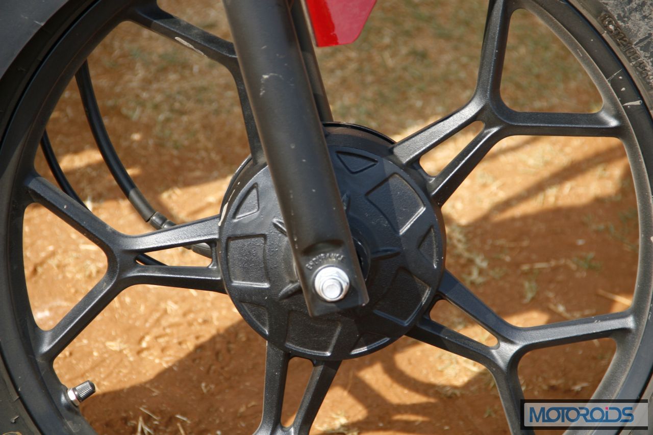Secondly, the suspension has been set up well. It’s neither too soft, nor too stiff. The dampers absorb the tension mid-corner rather adeptly, and there isn’t any wobbliness even as you transfer you weight from one side to another in situations, such as while negotiating a chicane. Tilting the bike mid corner feels more reassuring than most other 100cc bikes around. The Eurogrip rubber at both ends offered reasonably good grip on the dry and well laid out pieces of tar we rode the bike on.