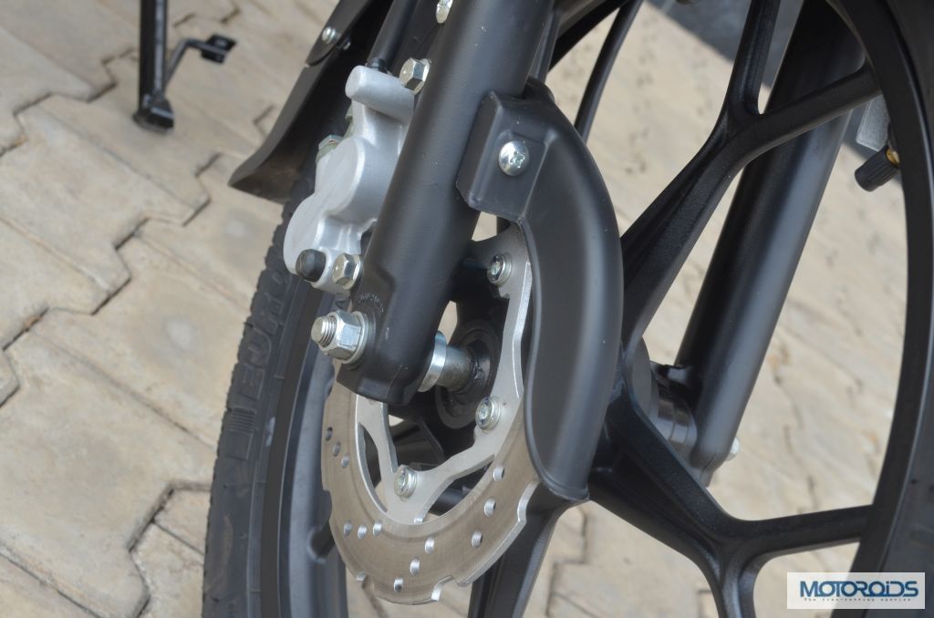 Braking is an aspect of the 125M where we came away with mixed feelings from our test ride. Our test unit came with the optional petal disc brake upfront and the customary drums at the rear. The front disc is a definite step-up from drum units but we still felt that it lacked sharpness and that sense of urgency at higher speeds. Bajaj says they have deliberately kept it so, keeping in mind first-time users who might just lock up the front unintentionally during panic braking. We were also told that the front disc brake cover is more than just cosmetic, it really does serve a utilitarian purpose, staving off dust and mud and prolonging the life of the rotors.