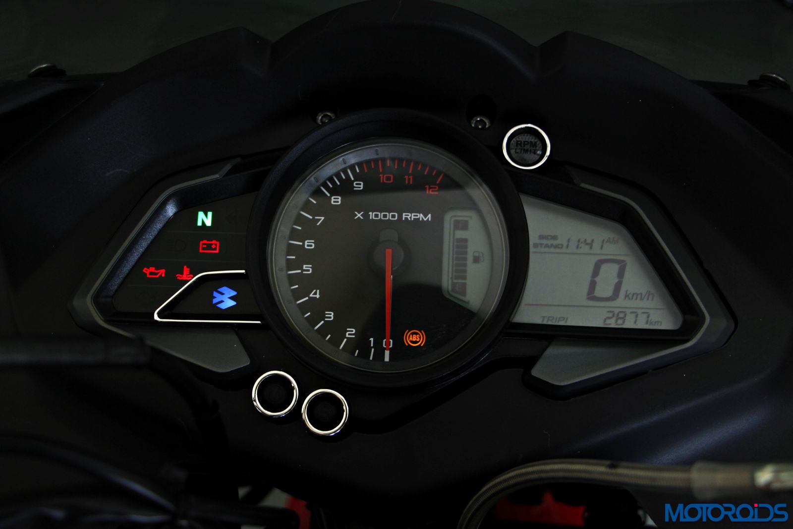 Instrumentation on the RS is also a carryover from the NS, which is not a bad thing at all, as we are big fans of the latter. It is big, legible, and comes packed with all the info you need on the road, but not so much that it overwhelms you as we have seen on some KTMs and Ducatis. Pride of place goes to the large tachometer, with an integrated digital fuel gauge (and ABS indicators on the ABS-equipped model despite the fact that you can’t switch it off – more on that later). Flanking it is the digital speedometer, clock, twin tripmeters and odometer at the right while the left houses the telltale lights including an always backlit Bajaj logo. Perched on top of it all is a bright orange upshift light, that comes into action once you hit the 11,000 rpm redline despite the tacho being marked red at 9,500 rpm.
