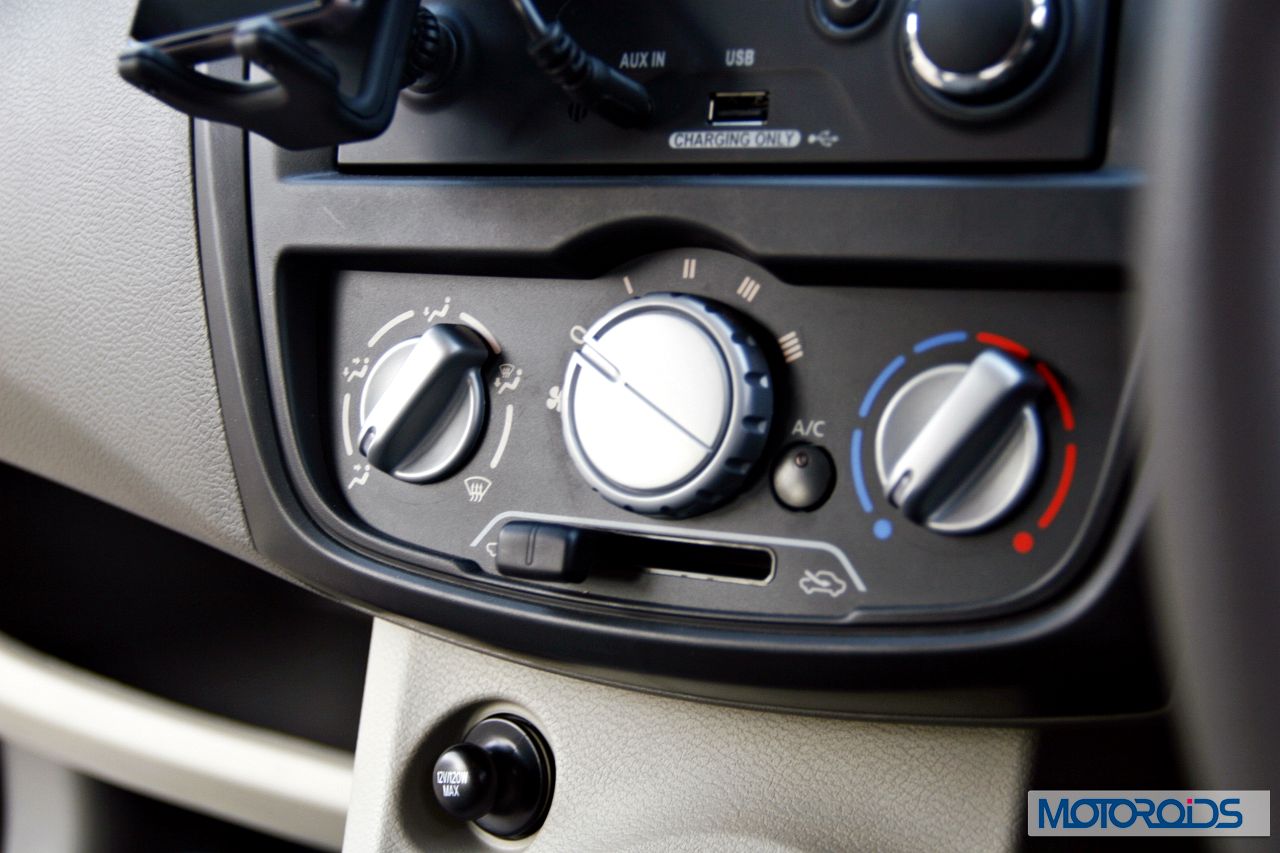 There is no CD player on the Datsun Go, which we hear will be available as an accessory. However, there is a pod mount where you generally have your audio unit. Now, you can place your smartphone on this mount and use it as a navigation device. Also, you can connect the system to the Aux-in socket on the center console to play music via the basic twin speaker system which comes as standard. It’s an average sounding unit, and prone to distortion as you increase the volume. There is a volume contol knob too, along with a power on-off button. There is a USB socket peeping out of the audio unit, but this one doesn’t play any music, and is meant only to charge your electronic devices. There is also a 12V power socket in the center console.