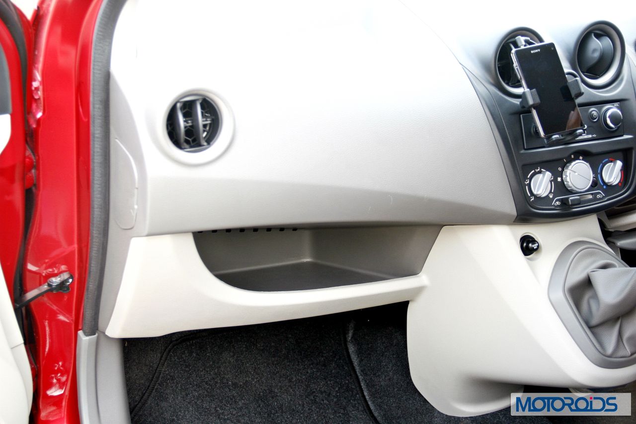 The glovebox on front passenger’s side is an open unit with no lid. This unit has a sloping interior shape towards the bonnet and a raised lip to ensure than nothing falls off it. There are perforations on the far end of the crevice which for once made us think that it’s a chilled unit. However, on enquiring the product development team, we realized that the holes are required for being able to mould the inside of the glovebox in the requisite shape. While a closed glove box is more preferable, the Go’s glove box offers an advantage of its own. Its unique shape and smaller size allows more knee-room for the front passenger. While the glove boxes and the storage compartments on some other models strike with knees, the Go’s front passenger gets ample knee room even with the seat moved relatively towards the front.