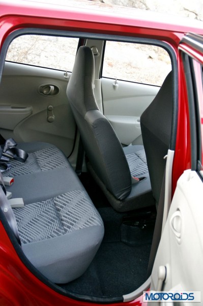 Front seats feature slim backrests to maximize the space for back benchers. Headrests are integrated in the seat like on the Hyundai i10. Even with their not so premium looking design and less width, both the front seats are quite comfortable with good thigh support and a special design to offer extra support to the lower back. Datsun engineers have paid special emphasis on ensuring that the lower back remains unstressed even during long drives, and have shaped the lower portion of the seat uniquely to attain that. The positive result is quite evident, and the seats do come across as extremely comfortable as regards back support