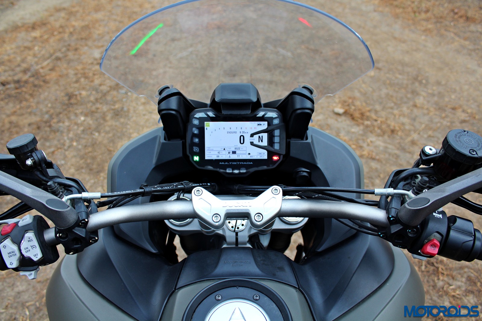 As you would’ve noticed, there is no key hole. Just like all premium motorcycles, the Multistrada 1200 Enduro comes with an electronic key which works in 2-metre range. Once in range, a press of the key-on button will switch on the panel. The same button can be used to turn off the motorcycle and lock the handlebar.