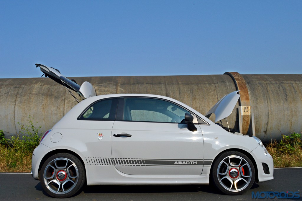 Just so you’re not reminded of Fiat, Abarth puts its logos all over the car. The pencil line moustache up front now grows around an Abarth logo, while the compact tail gate also brandishes the scorpion. The lower halves of the sides are embellished with subtle Abarth graphics that fit the bill perfectly.