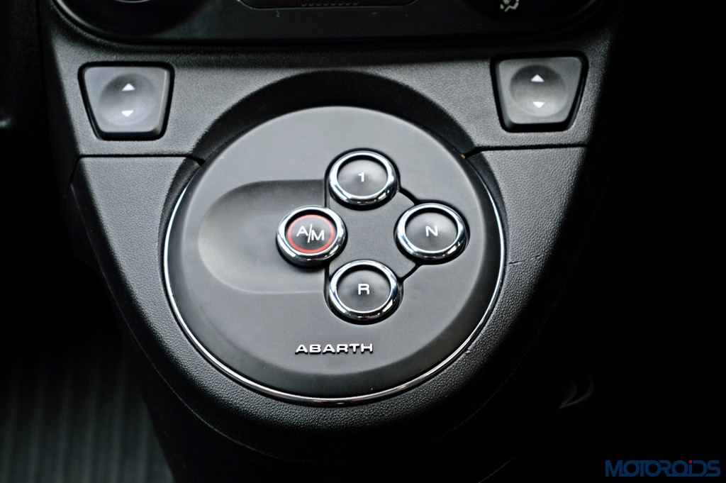 The little Abarth needs a twist of the key to get its feisty little heart to spurt into life. The twin exhaust tips at the back chime in with their presence with an idling note that’s on the subtle side of raucous. Cutesy this little Abarth may be, but the voice it emanates is decidedly throaty. We don’t get the manual transmission option in India, which is a bit of a shame, as stick shifters more often than not equate to a more involving driving experience. Instead, there’s a sequential automated gearbox with steering wheel shift paddles, which has left the lower half of the center console with a bunch of buttons.