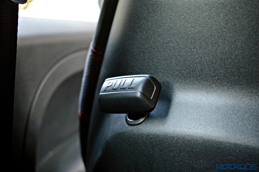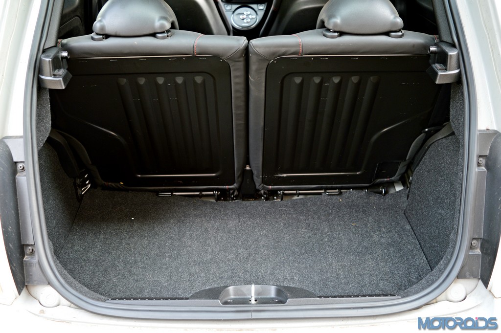 Entry to the rear seats (yes, there are a couple of them) is via pulling down the front seat backrests. While ingress is fairly simple, space at the back is cosy enough only if you’re into midget role playing.