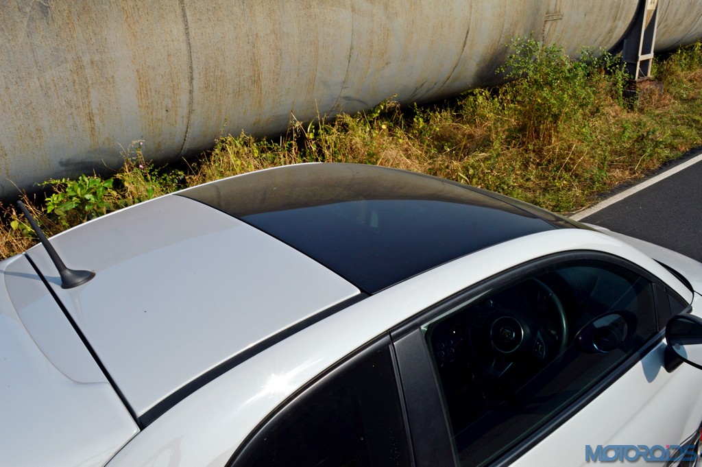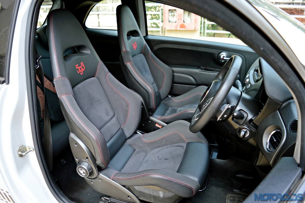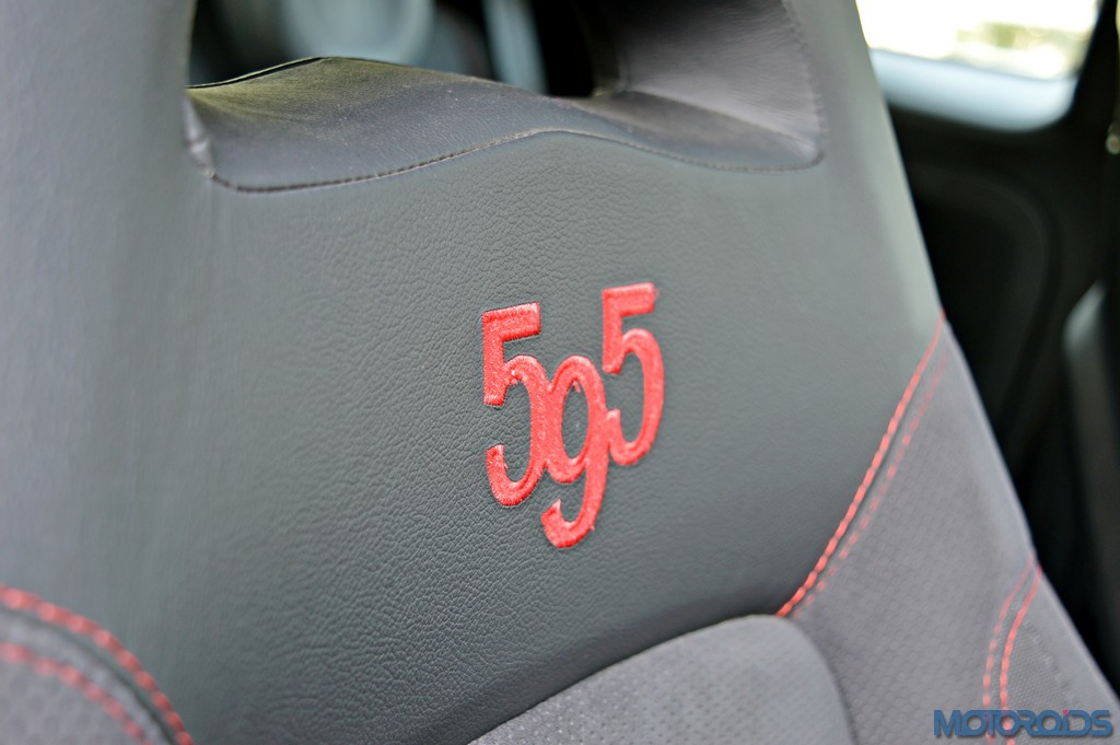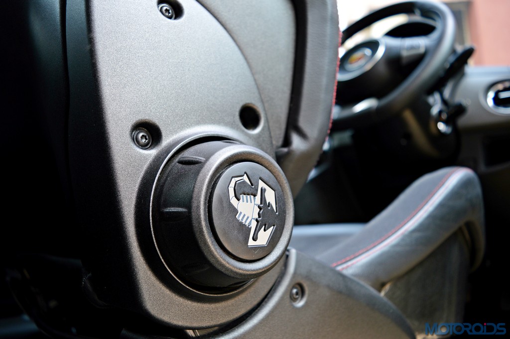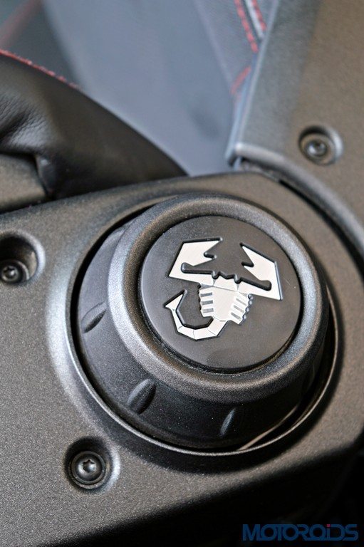 Just like the exteriors look special, those seats look special too. The integrated headrests even have openings to slip on a racing harness, while the stitched 595 lettering is in liue with the contrast coloured stitching. Even the seat recliner knobs have Abarth’s scorpion etched on them. The rest of the interior’s story isn’t so special though. The dashboard is a sea of hard touch plastics and the center console is too busy. There isn’t even a touch screen equipped infotainment system, or navigation. But one does get a panoramic sunroof that not only adds contrast colour to the roof, but also makes the driving experience a bit more special.