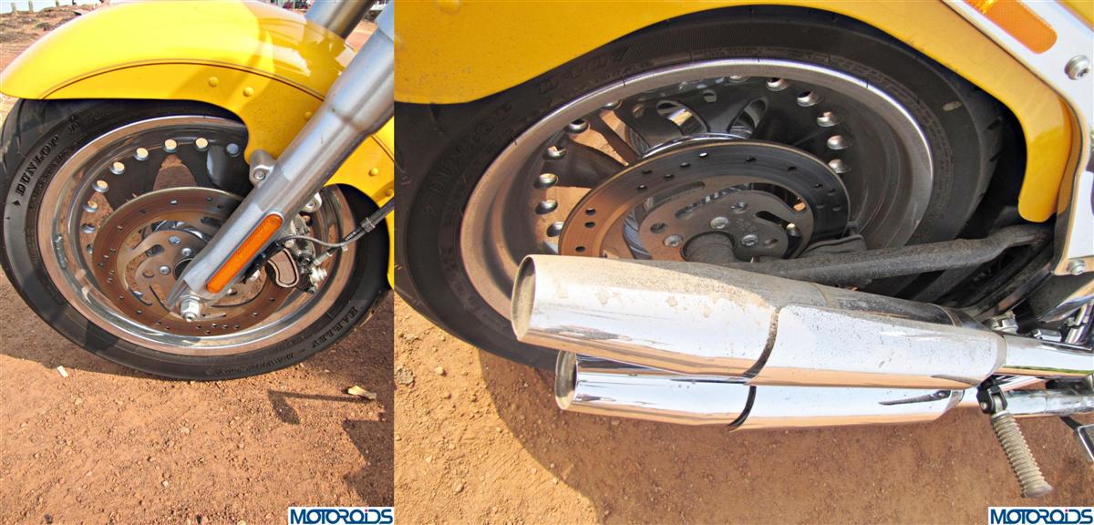 An enormous motorcycle with mindboggling torque figures needs equally good stopping power. The ABS equipped four piston front 292mm single disc and a ditto sized two piston rear disc provides adequate braking ability- but the brakes are left wanting while slowing down or stopping from high speeds. Also the ABS doesn’t feel as efficient at higher clicks as they do at regular speeds. The levers demand a harder squeeze for effective braking. I wish the Fatboy came with twin discs upfront equipping it with that added stopping ability or at least a larger diameter front rotor.