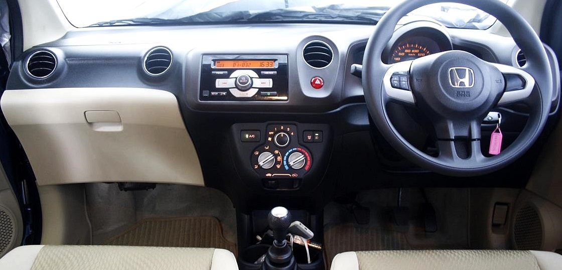 The interiors of the Amaze look strikingly similar to those of the Brio hatchback. Nothing surprising as majority of the panels have been shared between the two cars. The dashboard, which too comes from the Brio, sports unconventionally placed air-con vents and a similar sporty-looking instrument console. Worth mentioning here is that while this sporty dashboard looks nice on a nifty hatch, it doesn’t look entire in sync with the character of a comfort oriented sedan. The three spoke steering wheel and the beige-black color theme, however, do look nice overall.