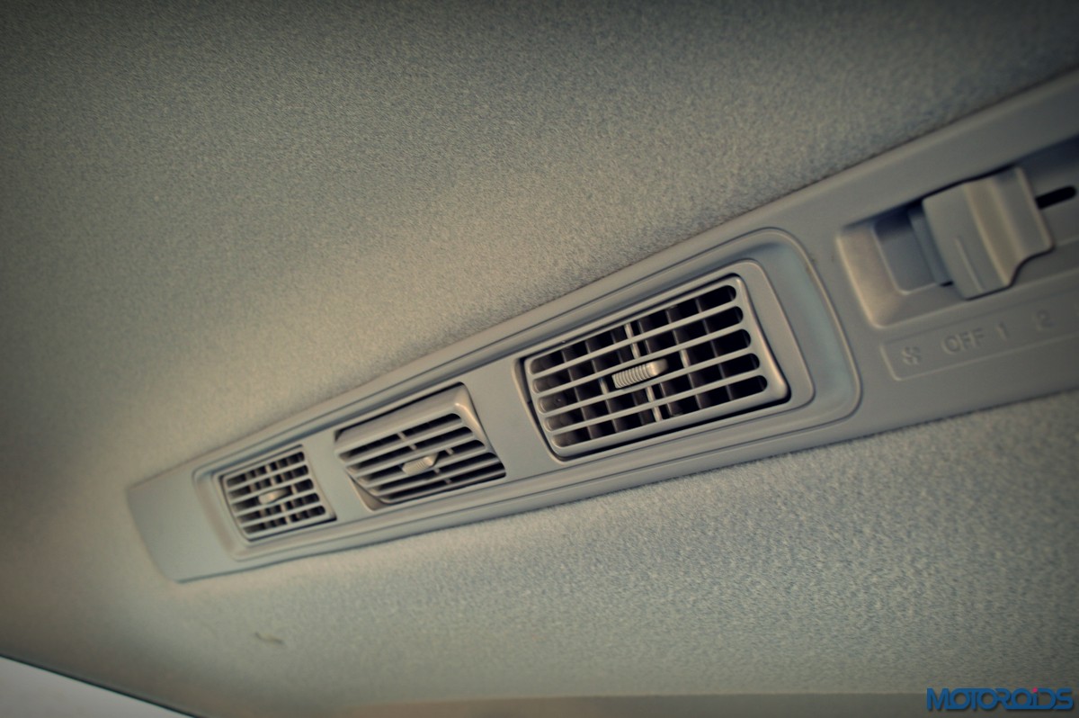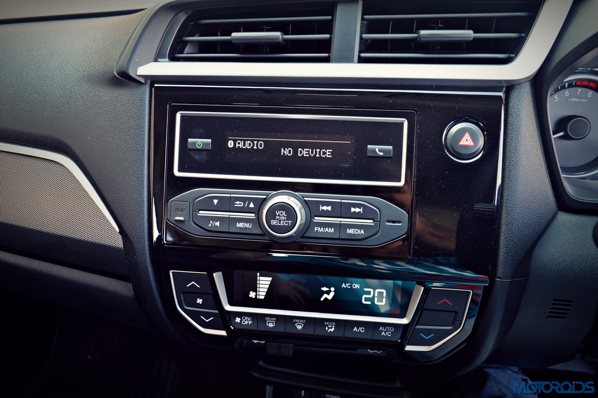 The piano black accented center console, like on the Amaze doesn’t feature a touch screen equipped infotainment system, which is a glaring omission in this segment. Instead, it gets an integrated unit with Bluetooth audio streaming, and radio, apart from USB, Aux-in and smart phone connectivity. Sound quality from the six speakers is average. Below the infotainment system lie the automatic air conditioning controls, which are shared with the Amaze as well.