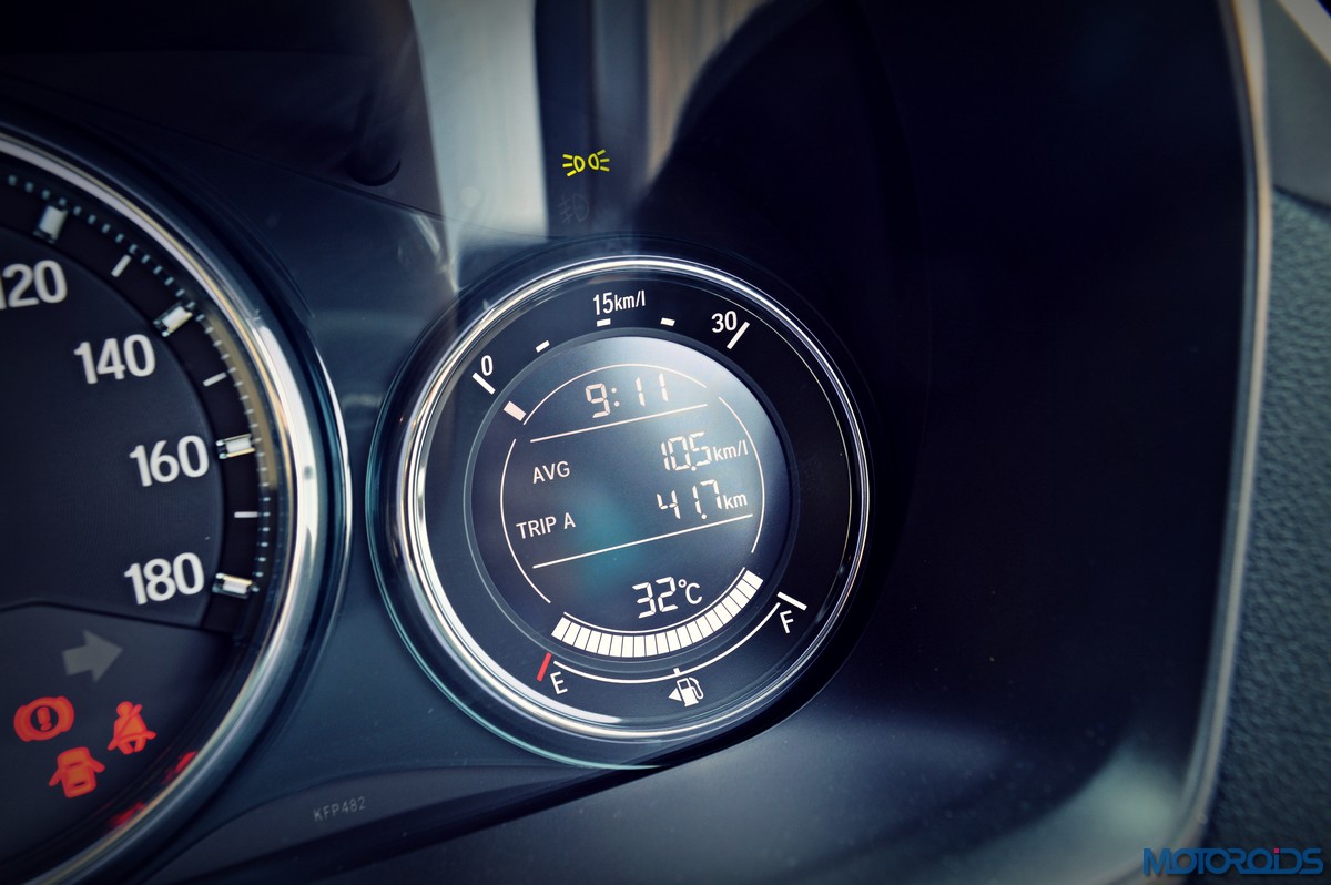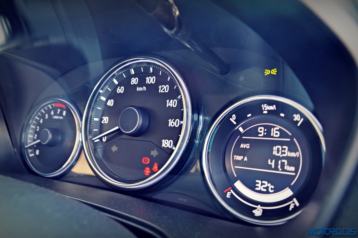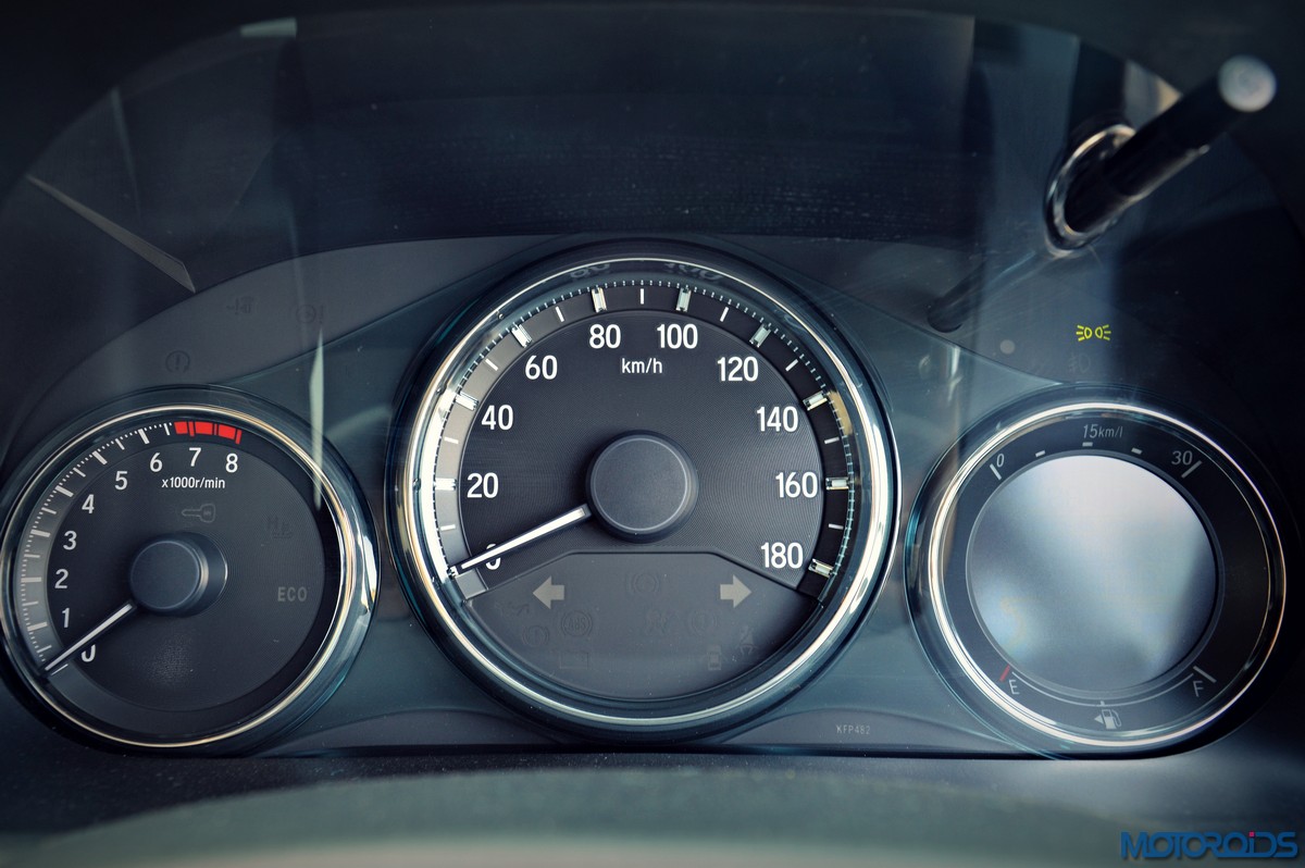 The BR-V, however, gets a different steering wheel which sets it apart from its lesser endowed cousins. This wheel, last seen on the previous generation Jazz definitely feels richer than the ones in the Brio, Mobilio and the Amaze. Behind the new wheel lies the Amaze-like instrument cluster with its large, legible dials and the trip computer which also shows instantaneous and average fuel economy readings, outside temperature, and the time.