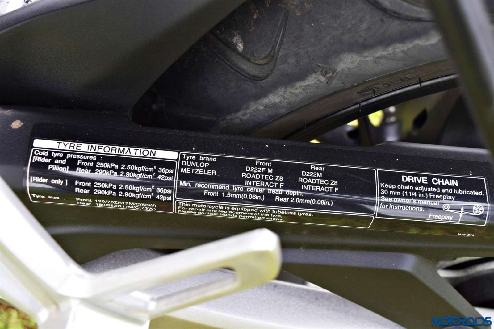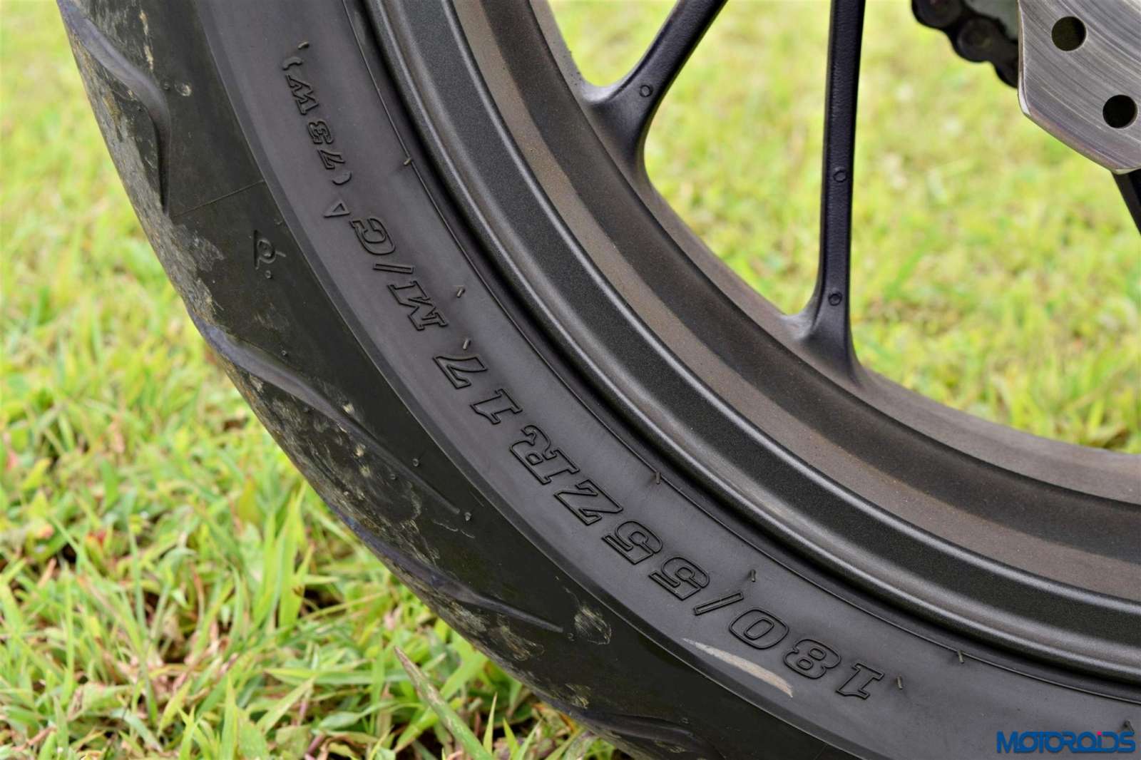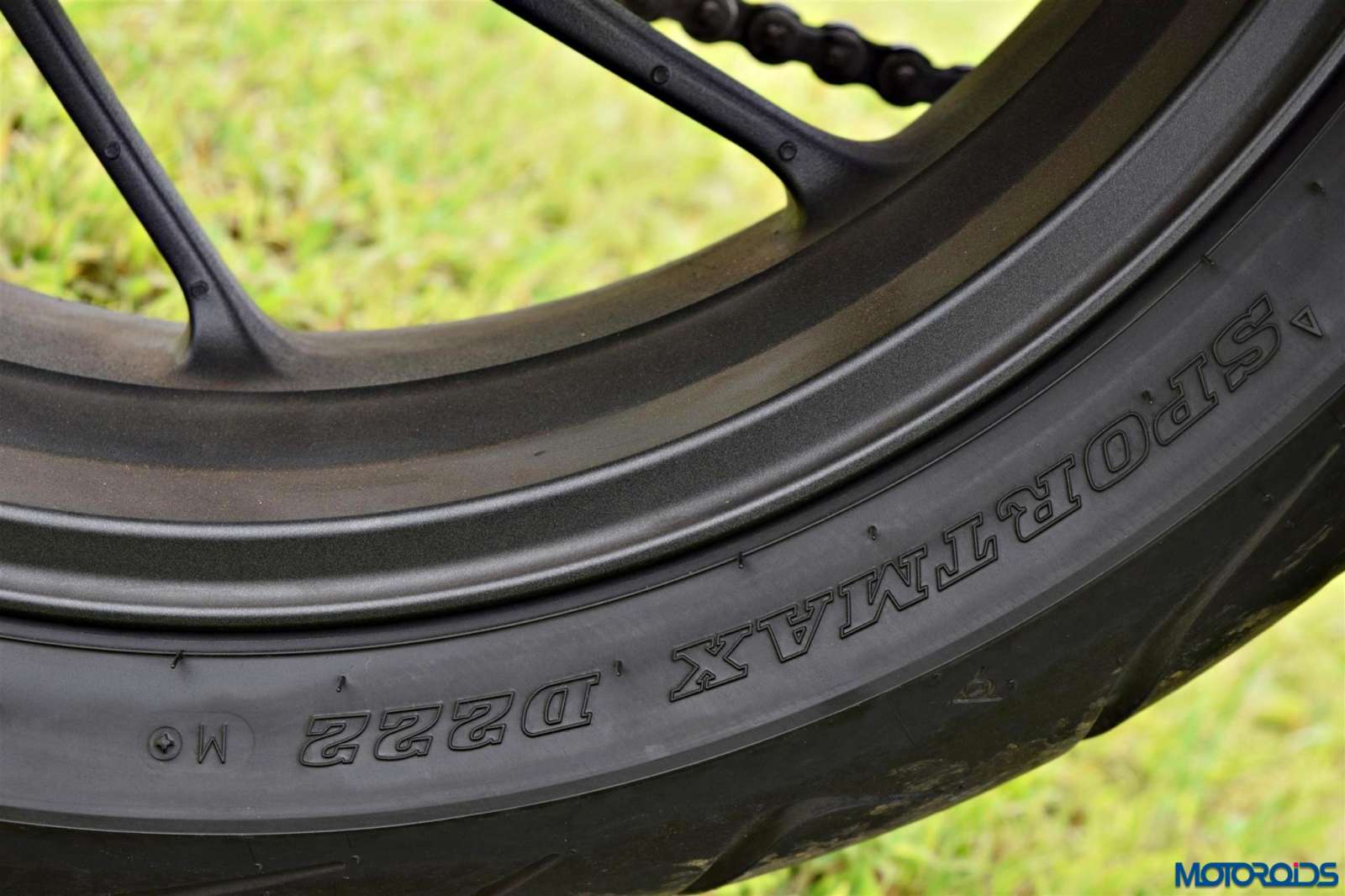 • The 12 spoke cast aluminum wheels come shod with Dunlop Sportmax D222 tyres (120/70-ZR17 front, 180/55-ZR17 rear) that offer adequate grip, but the rear feels weaving out of line a bit when pushed hard into corners.