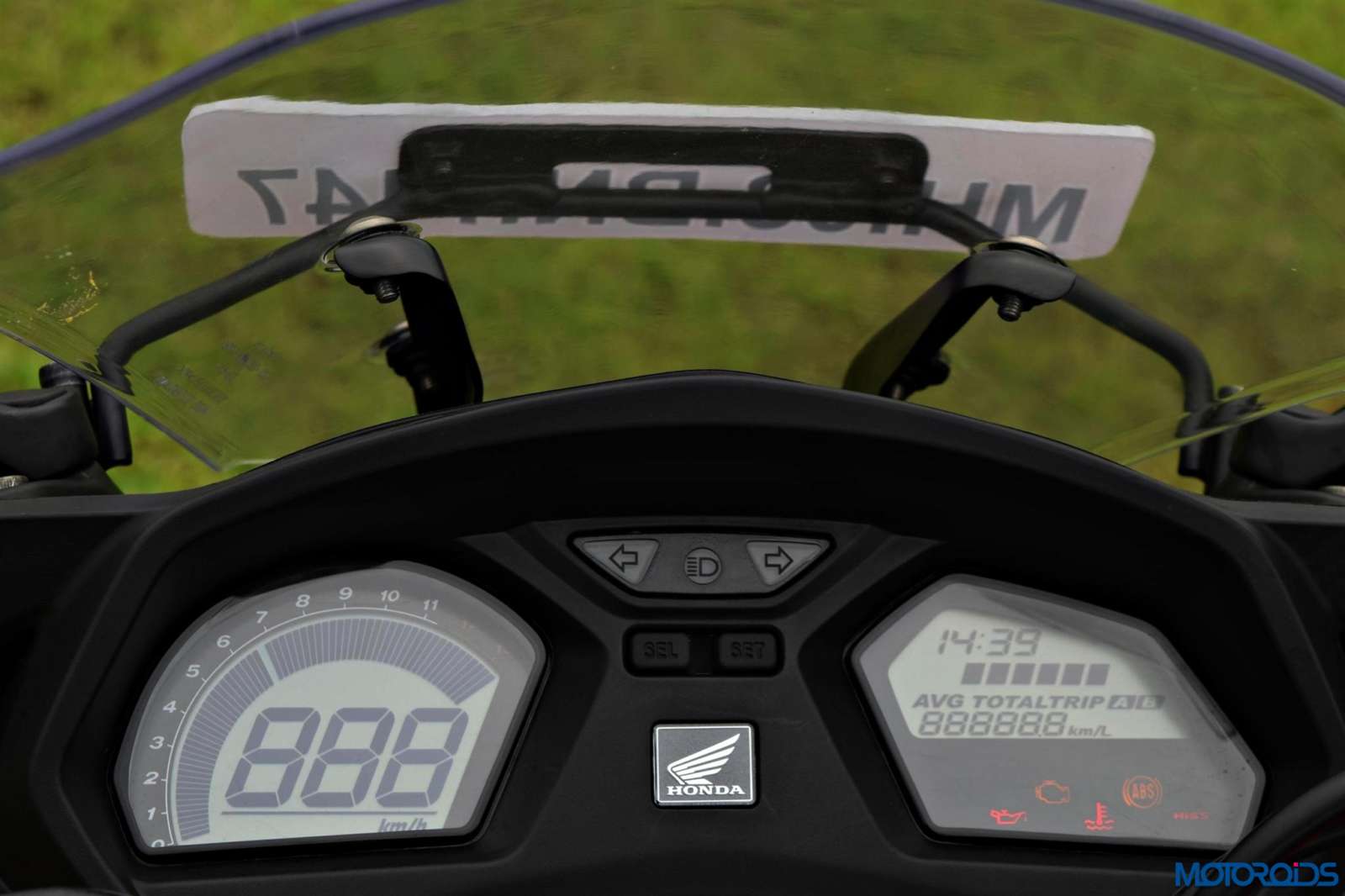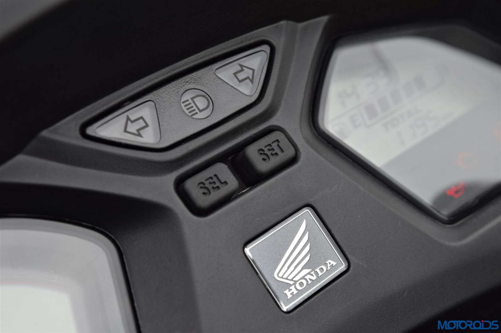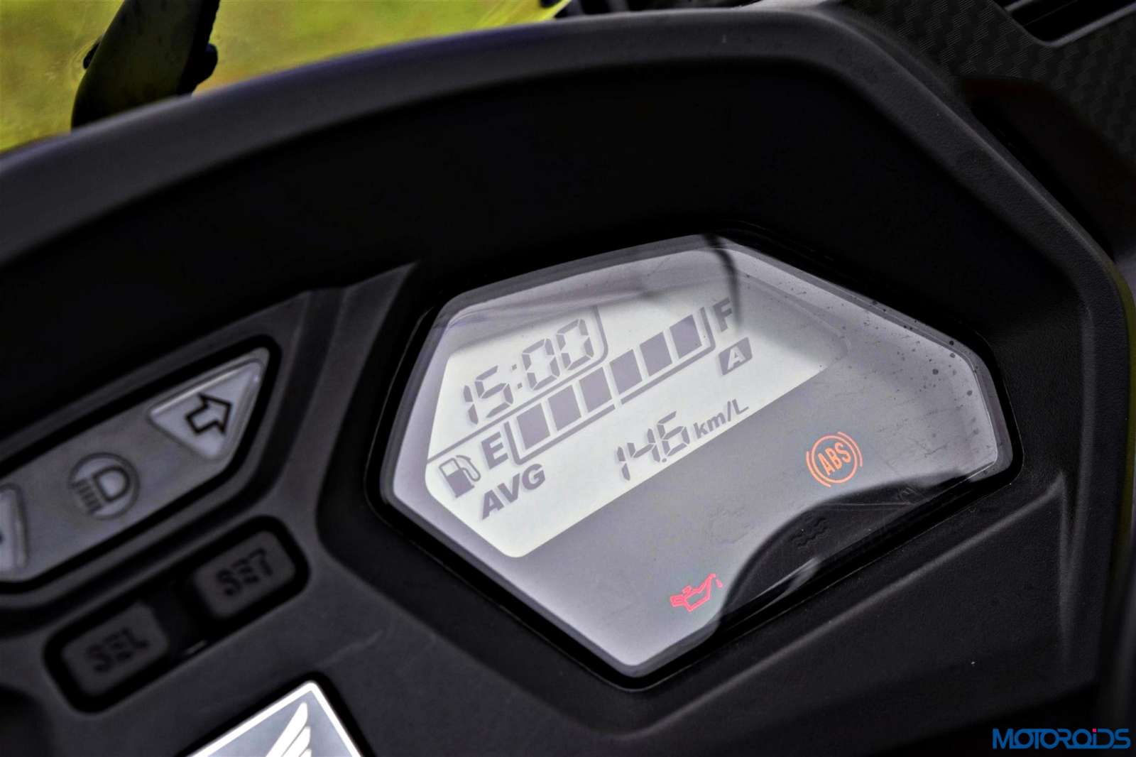 • The white backlit all-digital dashboard might not be the most modern looking but offers twin large screens which are easy to read under bright sunlight. The left side of the console indicates the speed and the revs whereas on the right you have the fuel gauge, clock, odometer, twin trip meters, mileage calculator and warning lights.