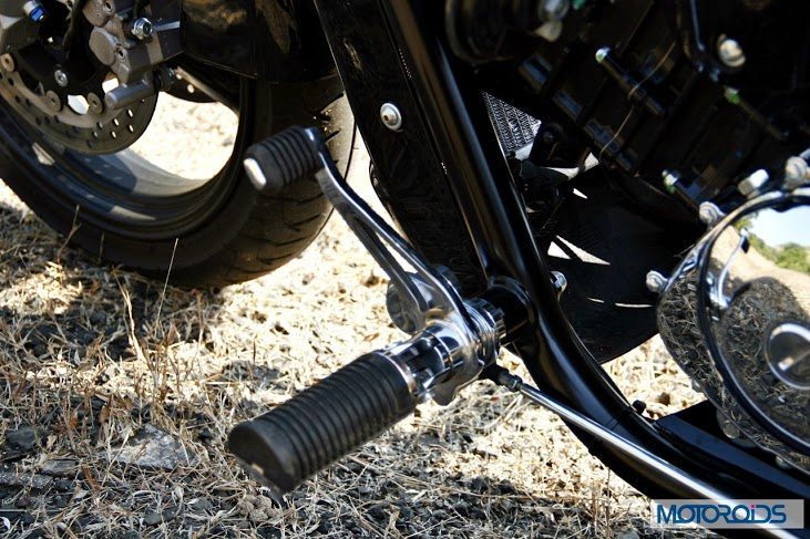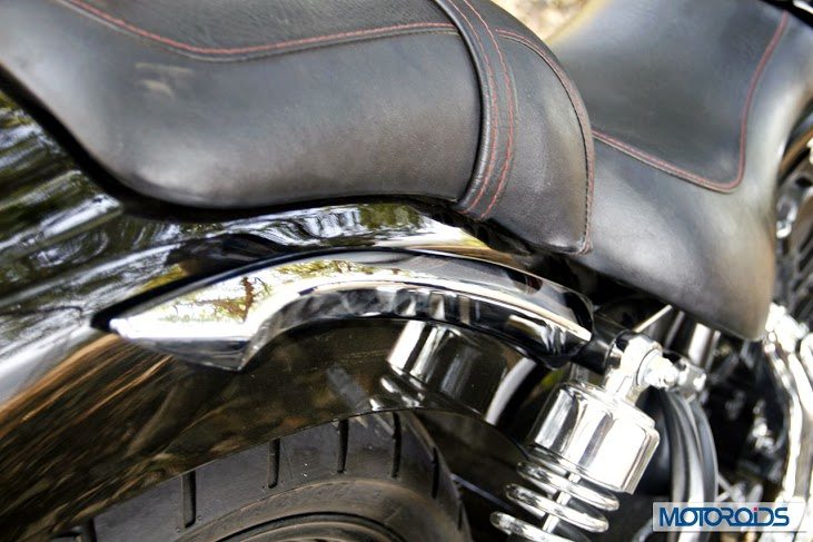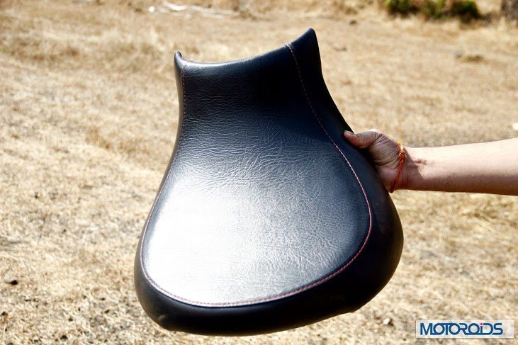 The round shaped mirrors offer adequate view of the trailing traffic but only when at distance. Vehicles driving up close to the motorcycle are difficult to spot in the RVMs and hence wider rectangular mirrors would have been a better choice. The wide leather seat with a red stitched trim not only looks premium but offers the right amount of cushion.