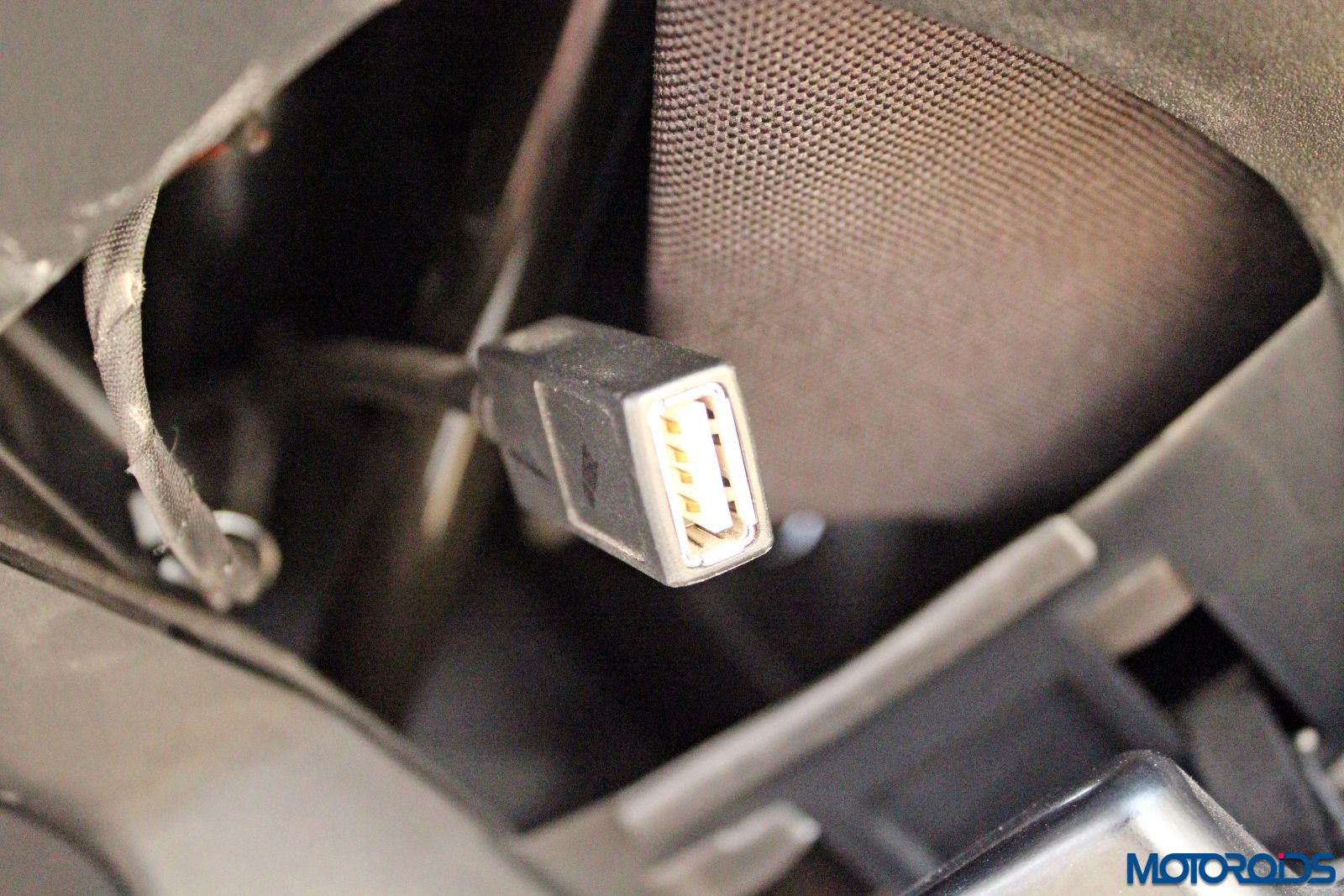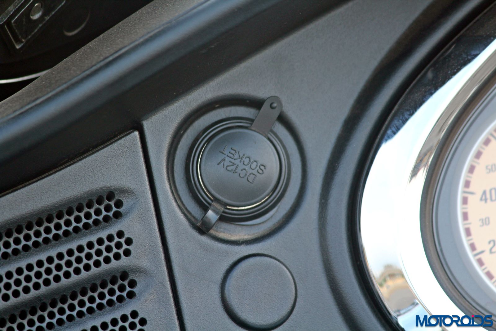 Occupying space along with the chrome lined instrument cluster is a 12V power outlet and a large switch for the front auxiliary lights. Next to that on either side are two 100 watt speakers! Yes, you read that right. They aren’t there for you to attach a microphone and announce your intent to invade Rome, but to listen to your favorite music via Bluetooth, a USB stick or if you wish, tune in to local radio. The sound that comes out is loud, really loud and crisp. The space beneath the right speaker has a glove box that has a USB slot and space to hold your cell phone too, should you wish to connect it with the music system via a USB cable.