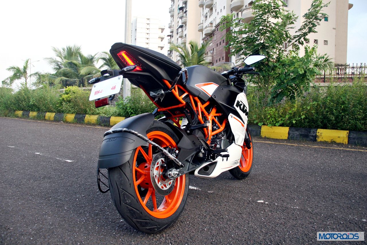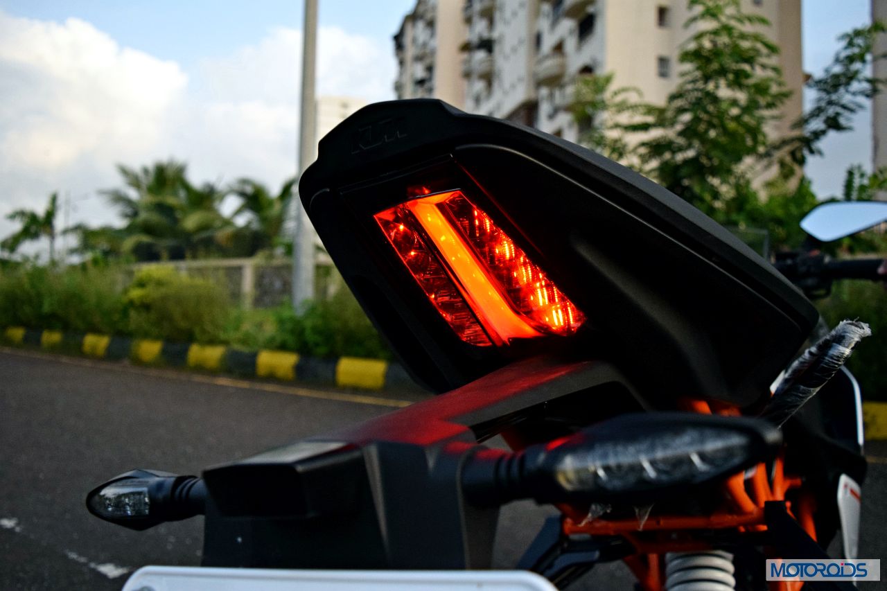 The underbelly exhaust, like its siblings, peeps out from the aft end of the undercowl, and appears extremely well integrated into the design. Another interesting element that grabbed our attention was the pillion seat. Can’t spot it? Well, that’s because it has been designed in such a way that it seems like part of the body. While the seat design provides a cleaner look to the motorcycle, the utility gets hampered a bit. The rear panel has a Kawasaki Ninja style pillion grab bar integrated into the body. The tail section has been inspired by its bigger sibling, the RC8. The LED tail lights add to the sporty look of the RC390 while, at the same time, provide better visibility to vehicles behind even in broad daylight. The tail light has been divided in three sections. The middle section is at peak illumination at all times. The flanking sections illuminate to the fullest when the brakes are applied.