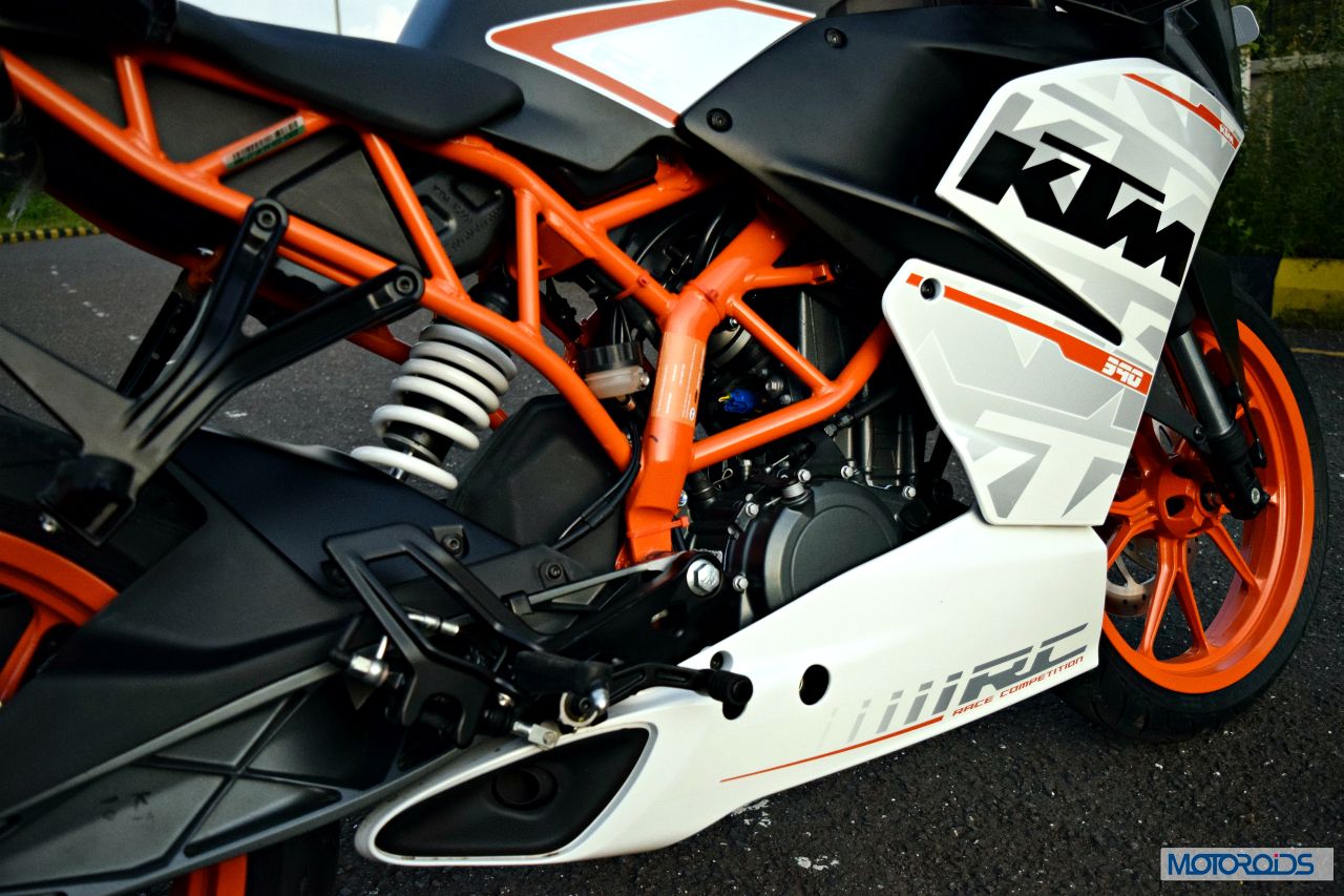 KTM have tried a new design element by keeping the powder coated orange trellis frame as visible as possible. This is a one off thing in the segment and works in RC390’s favour. The fairing is white in colour and is loaded with KTM stickers along with an orange strip which has 390 written over it. The lower cowl gets an ‘RC Race Competition’ sticker. A small peep hole is also provided to keep a check on the engine oil level.